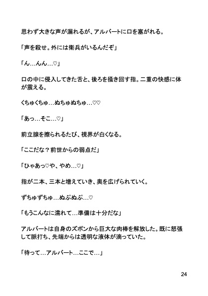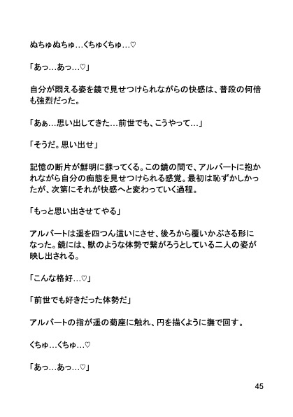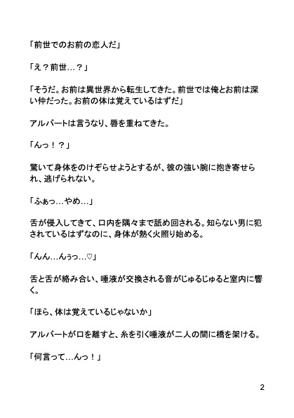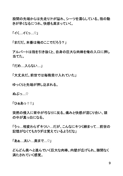 気がつくと異世界の王宮の寝室で目覚めた一条遥。記憶が曖昧な彼の前に現れたのは、前世での恋人だという美しすぎる王子アルバート。「体は覚えているはずだ」と言われた途端、見知らぬ王子の愛撫に身体が反応してしまう。乳首責め、耳舐め、アナル開発、前立腺マッサージ。かつては経験したはずの快感が蘇り、理性とは裏腹に体が素直に応える。執務室での緊張感溢れる行為、大浴場でのぬるぬるプレイ、そして鏡張りの部屋での羞恥プレイ。王宮の至る所で種付けされながら、遥の記憶が少しずつ戻ってくる。拒絶しながらも次第に快楽を受け入れていく遥と、彼を徹底的に調教するアルバート。記憶が完全に蘇った時、二人の関係は前世を超える熱さで燃え上がる――。「メス堕ち」と「記憶の蘇り」が交錯するメス堕ち物語。
