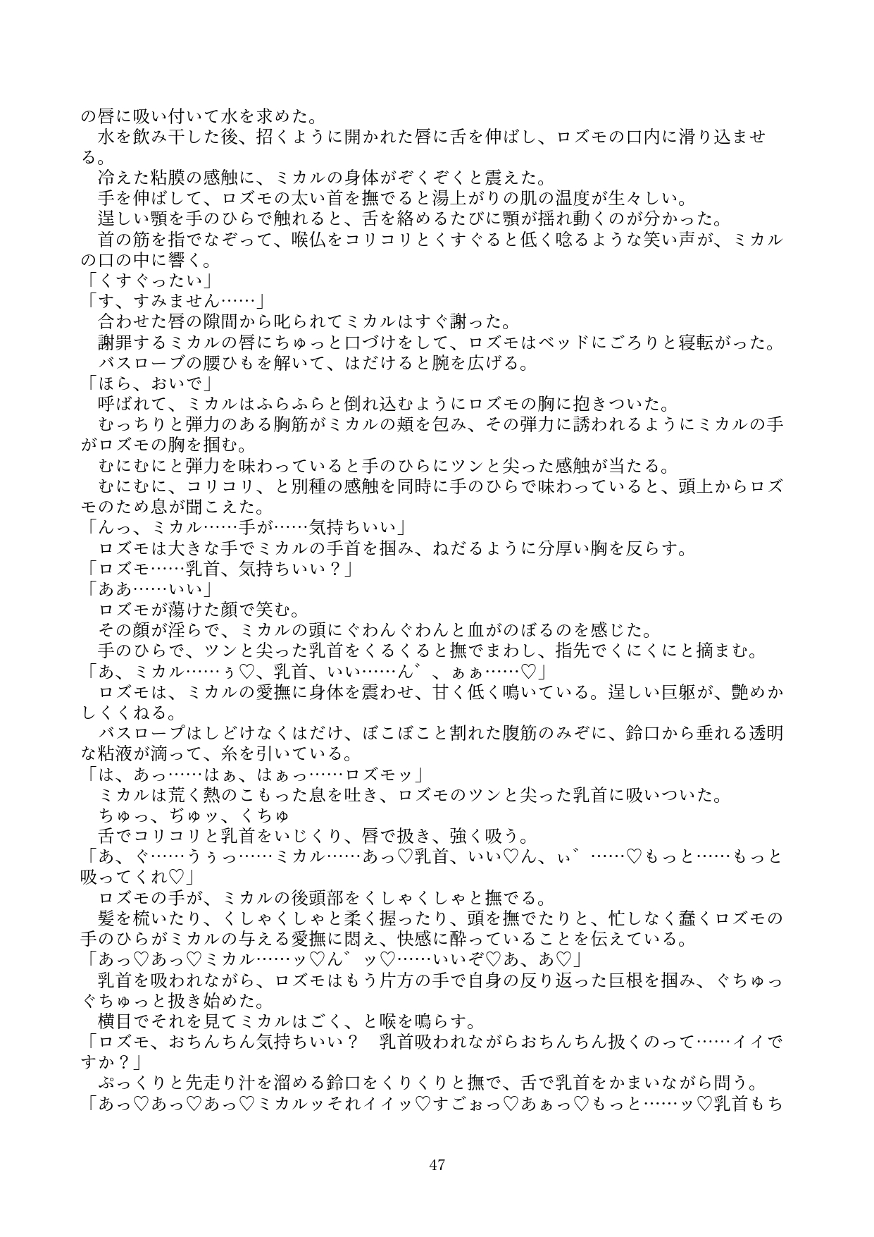 誘導の仕方がまた強引じゃなくて、ちゃんと男の子に選ばせてるのが上手いと思いました。肉体美と雄っぱい!潜望鏡はよかったです。この同人にはたくさんのカミングがあります。もう、そんなにいじめないでーってなるぐらい……でも、攻められている時のノアの表情にはかなりグッと来ました。