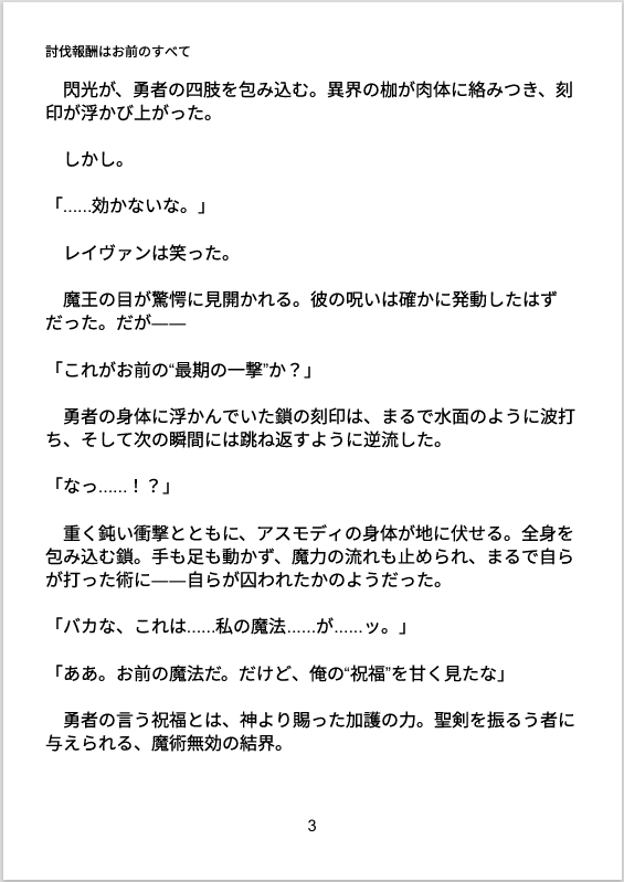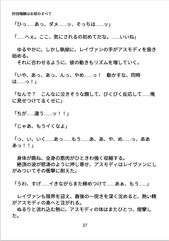 今作の見所はカレのヘソを曲げたシーンでしょうか。討伐報酬はお前のすべてと対になるお話。個人的ハイライト……「この浮気まんこめッ!」エロエロだけど、ほのぼのな話でした。えっちだなと思うと同時に棒アイスが食べたくなりましたw精神的に弱ってるとこに付け込んで食っちゃうようなやつなのに、ゴムつけてくれるだけで紳士に見えてしまったのなんでだろう……(笑)