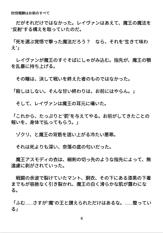 性格: 非常に誇り高く、冷静かつ計算高い。無敵の存在であり、他者を支配することに快感を覚えている。かつては無慈悲で恐れられる魔王だったが、レイヴァンとの戦いに敗れたことでその誇りが崩れ去り、最終的に支配されることを受け入れることになる。 英雄レイヴァンは魔王アスモディを討つため、長い戦いを経てついにその剣を振り下ろす。しかし、アスモディの敗北は単なる始まりに過ぎなかった。力強さと誇りを誇る魔王が、レイヴァンの支配によって徐々に崩壊していく。快楽と屈辱の中で、アスモディは自分の誇りを捨て、レイヴァンに完全に支配されるまでを描く――。