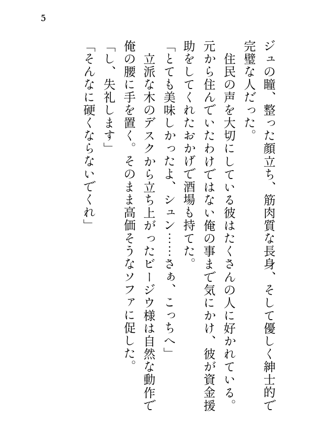 二年前に転移したシュンは今では異世界の暮らしを楽しんでいた。もともと調理人だったシュンは、近代ヨーロッパとファンタジー世界が混ざったような土地で酒場を持つ。酒場を持てたのは領主からの資金援助があったからだった。イケメンで優しく紳士的な領主、ビージウは時々シュンに性的な行為を望む。ビージウに憧れているシュンはどういう意図かはわからなくても行為を喜んでいた。彼がまるで恋人に向けるような言葉を口にしても、領主とただの酒場の店主だと自分に言い聞かせる。ある日旅人に、都でも成功間違いない店だと言われたことで、ビージウは嫉妬心と独占欲、執着をあらわにする。閉店後の店に来たビージウはいつもの完璧な領主ではなく――。