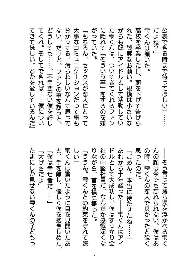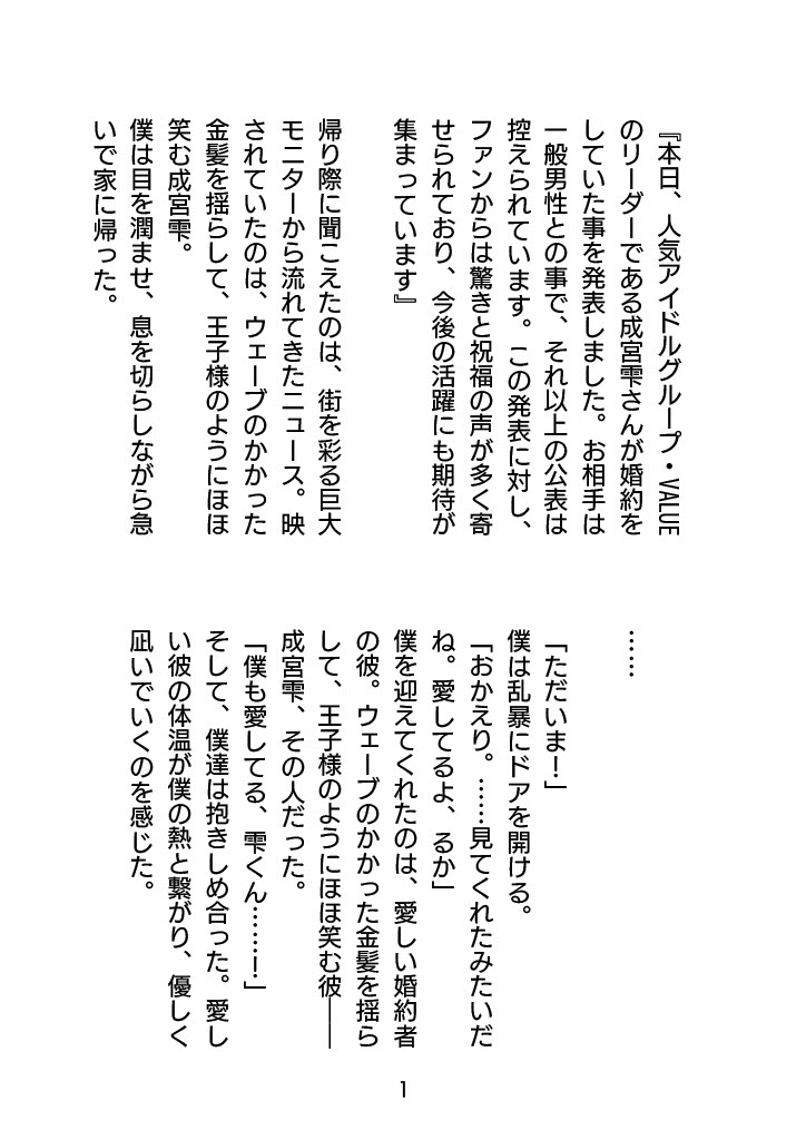 僕、るかには婚約者がいる……それは今をときめく大人気アイドル・成宮雫くん!彼とは交わした約束があった……『関係を世間に発表できる日が来るまで、セックスはできない』しかし、ついにその日が訪れる……!いつもは王子様みたいな雫くん。でも、初えっちに入った途端、猛獣みたいに豹変して…!?