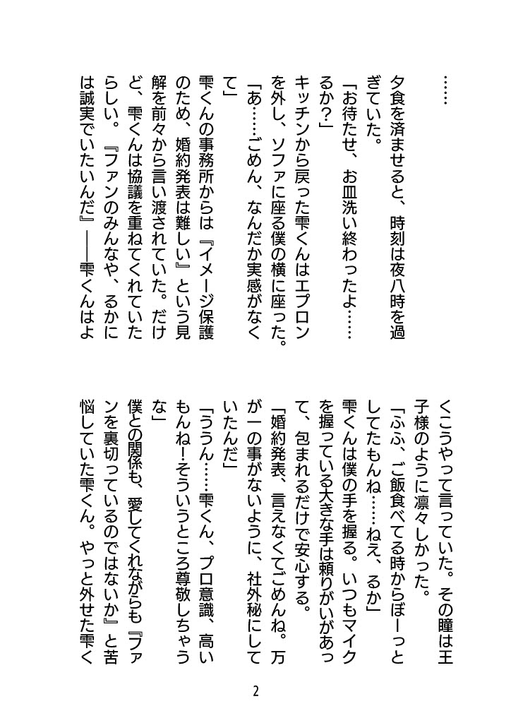 本文10,000字程度。ディープキスとセックスがメインのお話です。 攻め・成宮雫(なるみやしずく)人気アイドルグループ『VALUE』のリーダーとして活動するアイドル。その甘いマスクと王子様のような佇まいで人気を誇る。るかとは10年の付き合いで、婚約もし、今は同棲中。るかの事を愛したいと思っているが、約束があるため悶々とした日々を送っていた。
