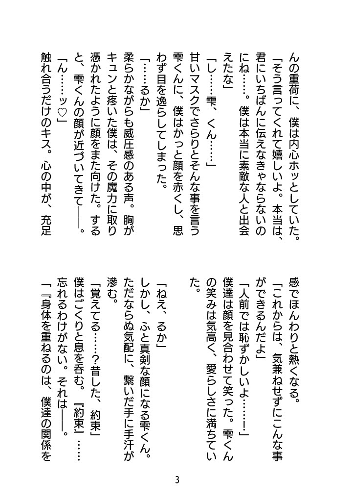 受け・篠原るか(しのはらるか)中堅の会社員として勤めるごく普通の男。雫の事を応援し、支えてきた。雫に愛されたいと思っているが、約束があるため悶々とした日々を送っていた。