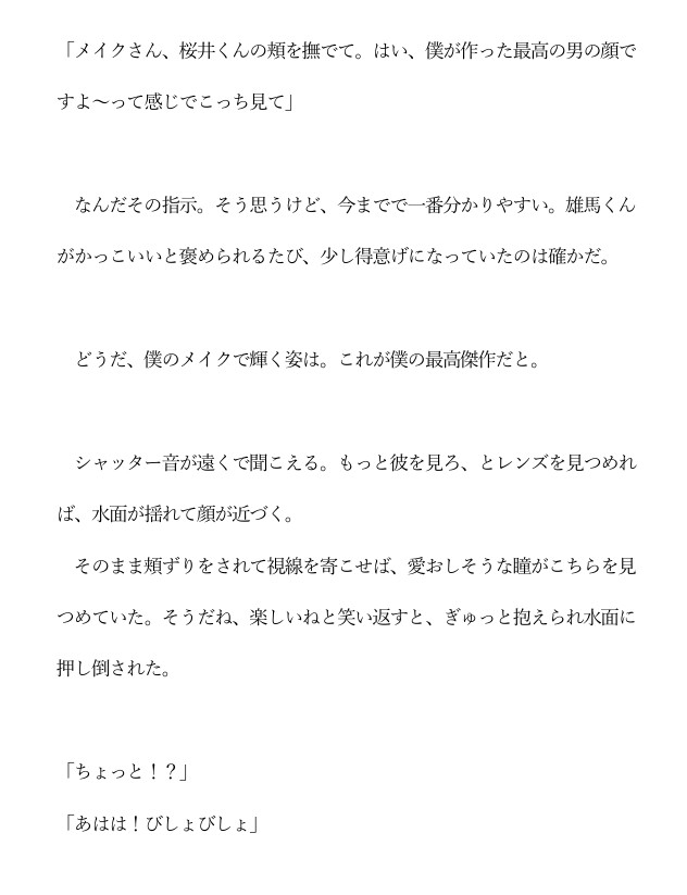 人気若手俳優・雄馬と、控えめながら腕は確かなメイク担当・涼介。表舞台と裏方、それぞれの立場から惹かれ合う二人の関係は、ある事件を境に一気に深まり——。