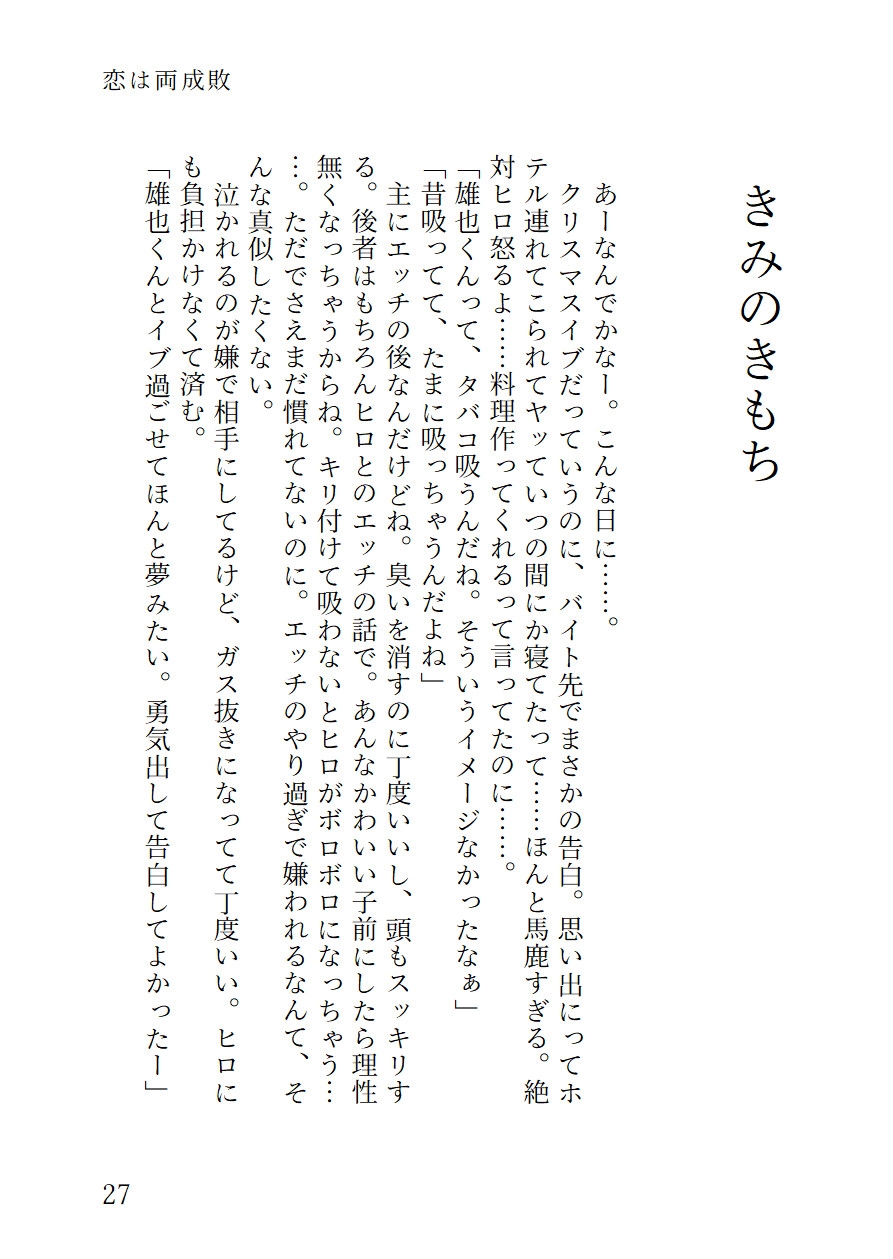 恋人になって初めてのクリスマス。バイトを終えた啓人はたくさんの食材を買い込み帰宅した。慣れない料理を作って待っていても、一向に雄也は帰ってこない。次こそは……なんて期待してもまた裏切られる。それでも別れられなくて啓人は雄也にお灸を据えることにした――