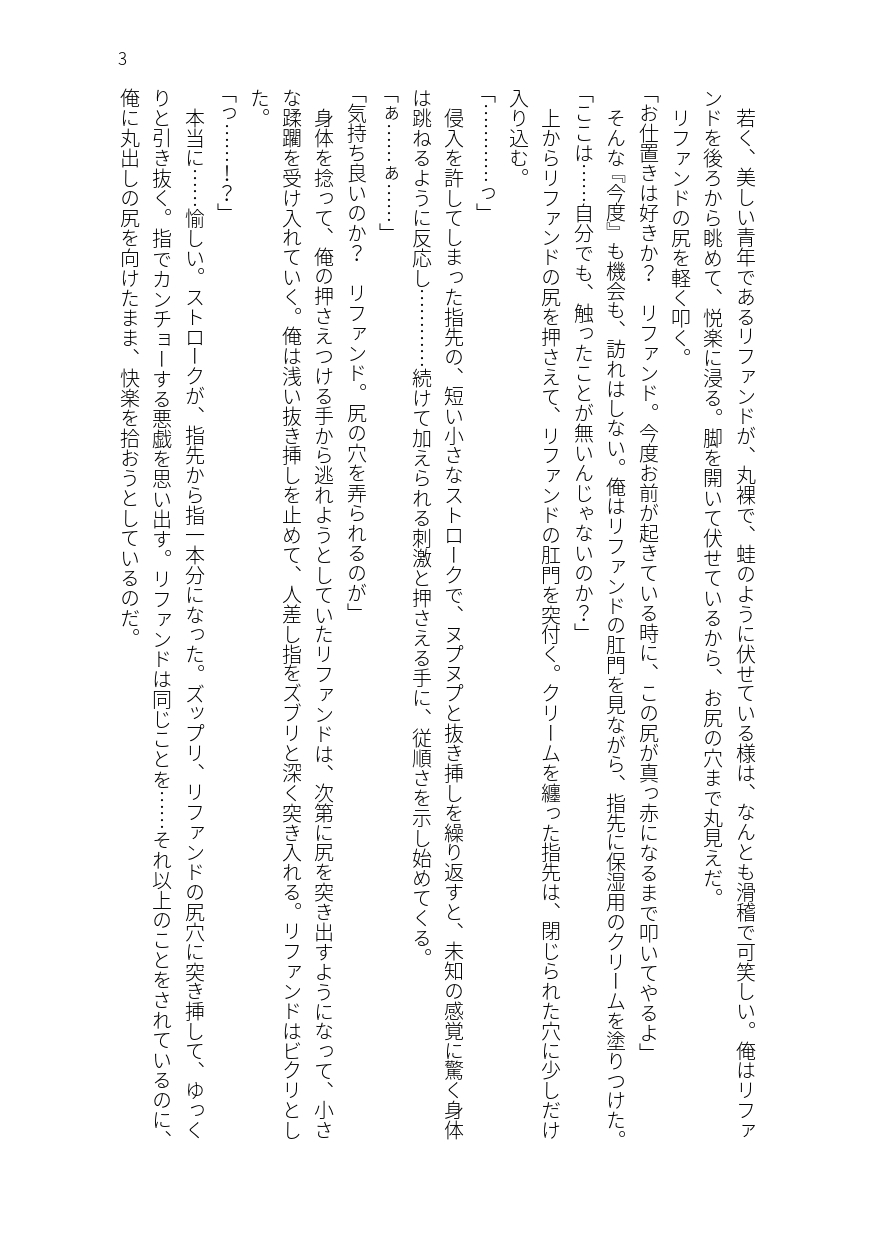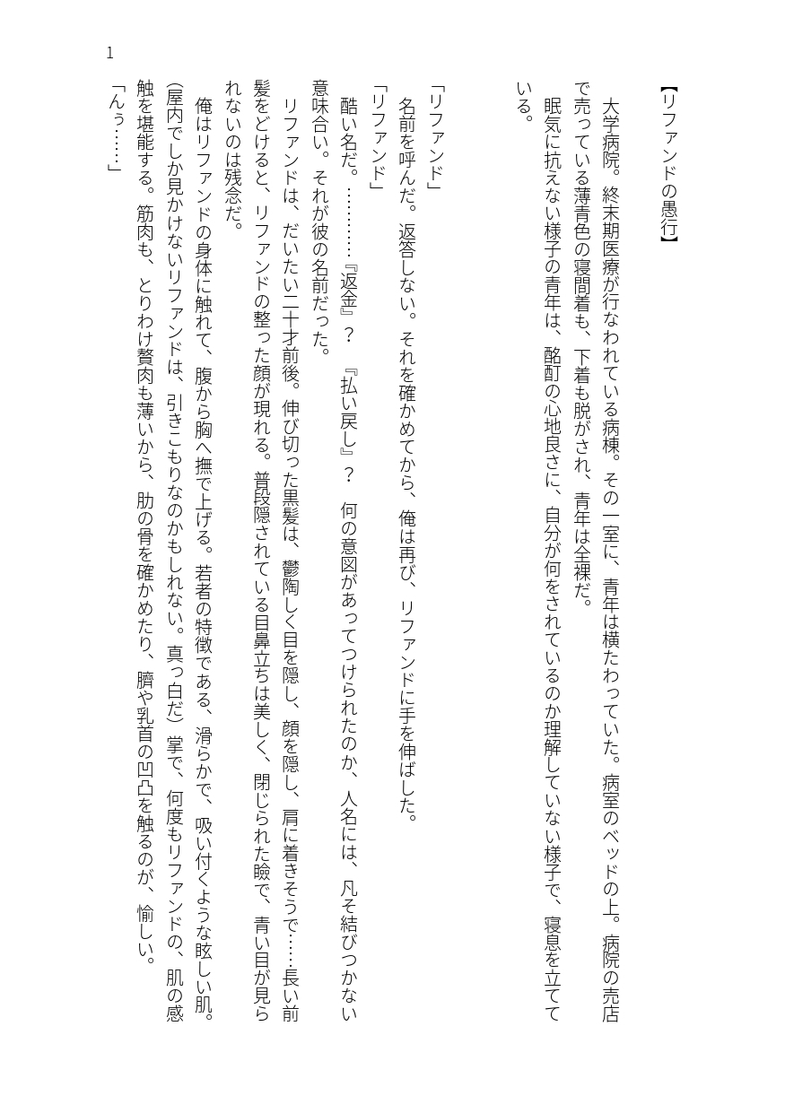 【登場人物】・中年男性×美青年・二之部清至(攻め)。成金の中年男性。大学病院の終末期病棟に長期入院している患者。多少自己中心的。・リファンド(受け)。黒髪碧眼の美青年、二十才。資産家老人の付添人。細身で穏やか、おとなしめ。