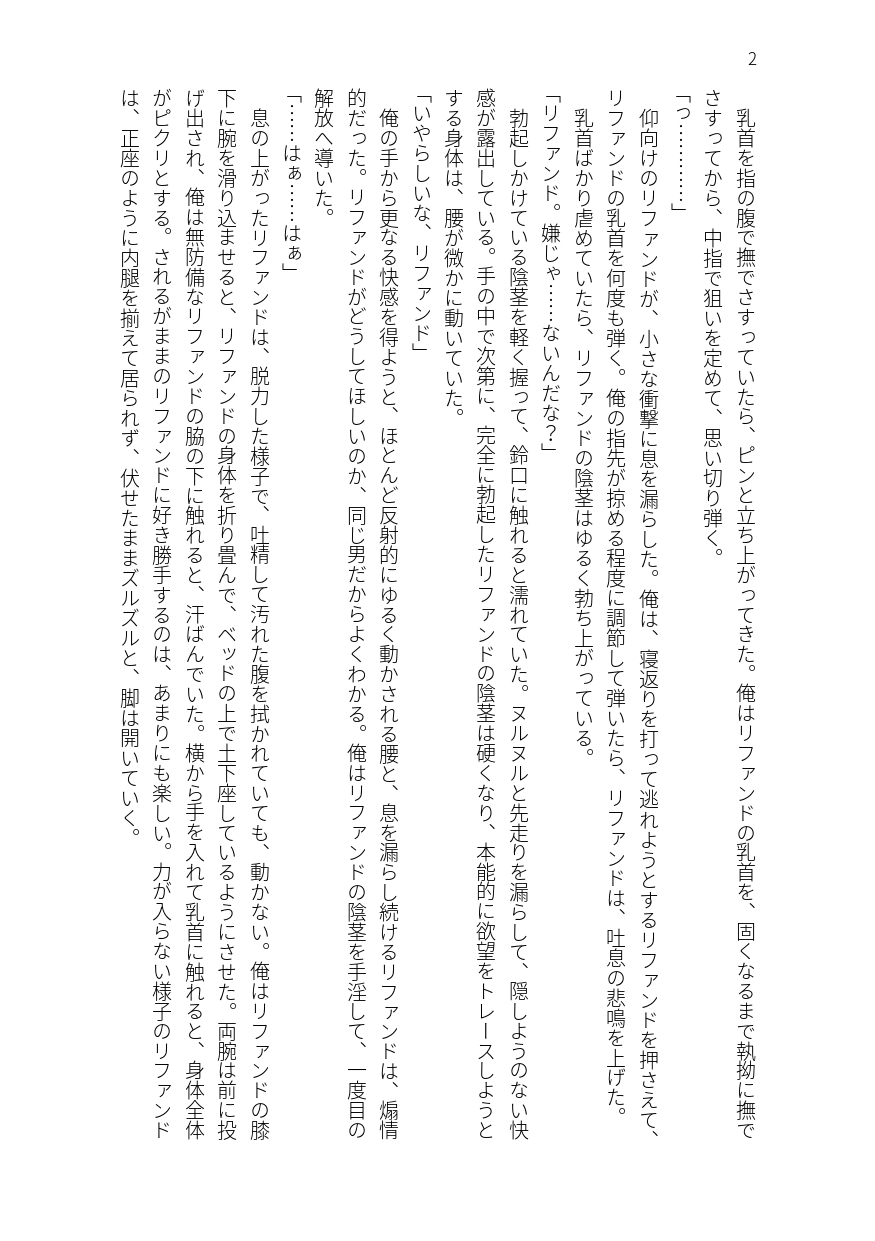 【文章について】・本文は39頁、16009文字。(改行、空白を除いた文字数)・二章構成で、内容は攻めと受けの出会い、再会。R18シーンは、二章とも序盤からです。・文体は、R18に特化した描写というよりは、一般的な小説寄りで、比較的かための文章かと思います。(画像の本文サンプルをご覧ください)受けは大分正気を保ったままなので、嗜好に合うか、試し読みをお勧めいたします。(♡や濁点の喘ぎはありません)・地の文が、攻め視点から受け視点へ一度移り変わるので、両者どちらのナレーションもお楽しみいただけます。
