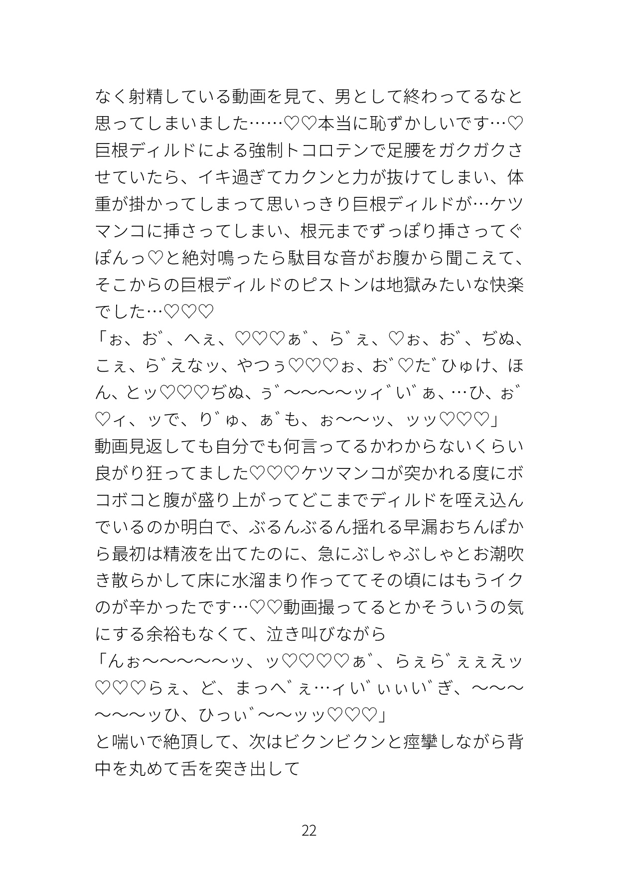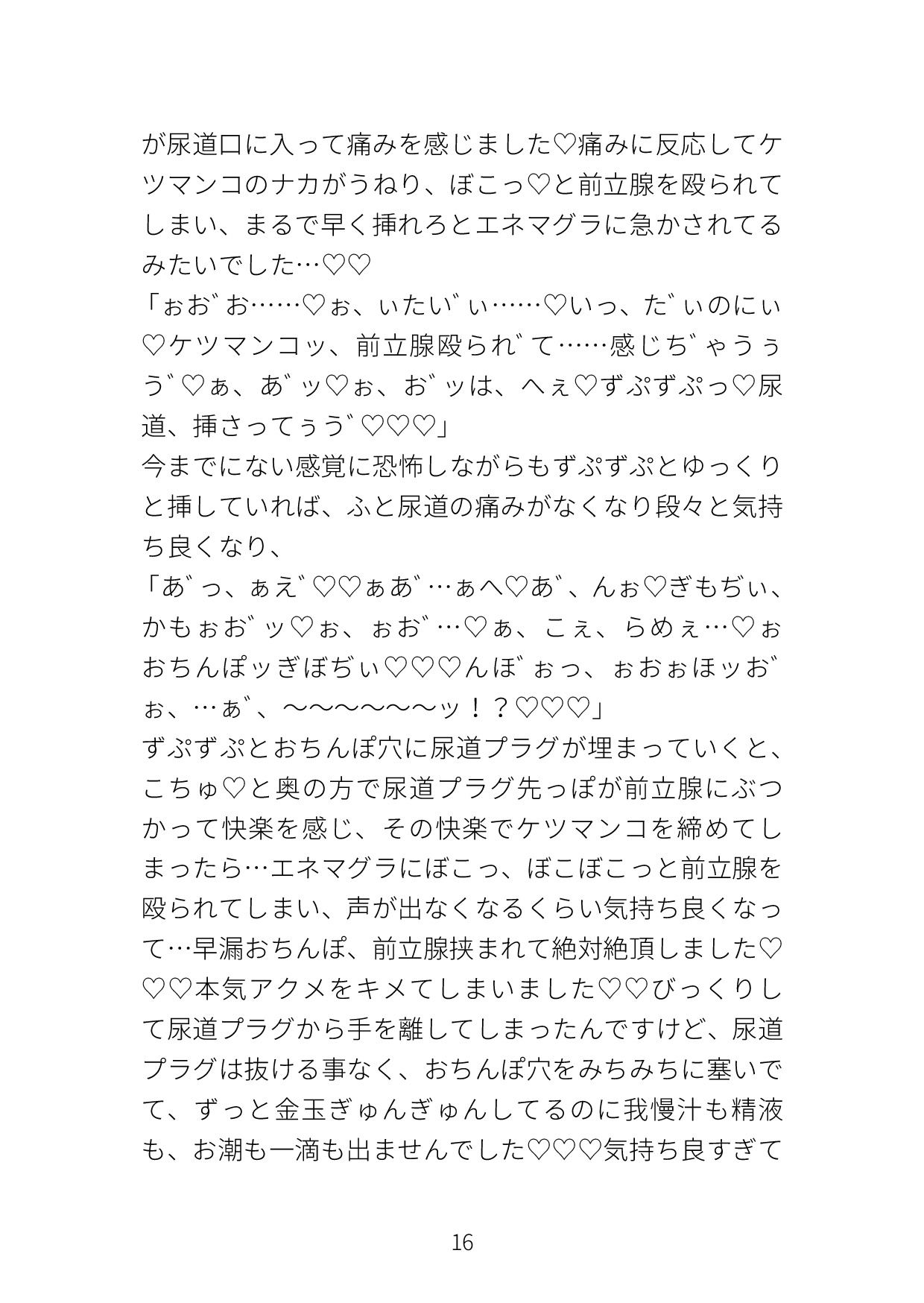 ・深夜の露出徘徊オナニー・初オナニー潮吹き小話・エネマグラと尿道プラグで前立腺挟み・ピストンマシンで巨根ディルド結腸責めオホ声、濁点♡喘ぎ等を含みます。文字数…約15000字