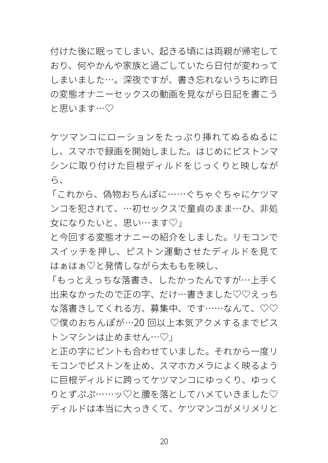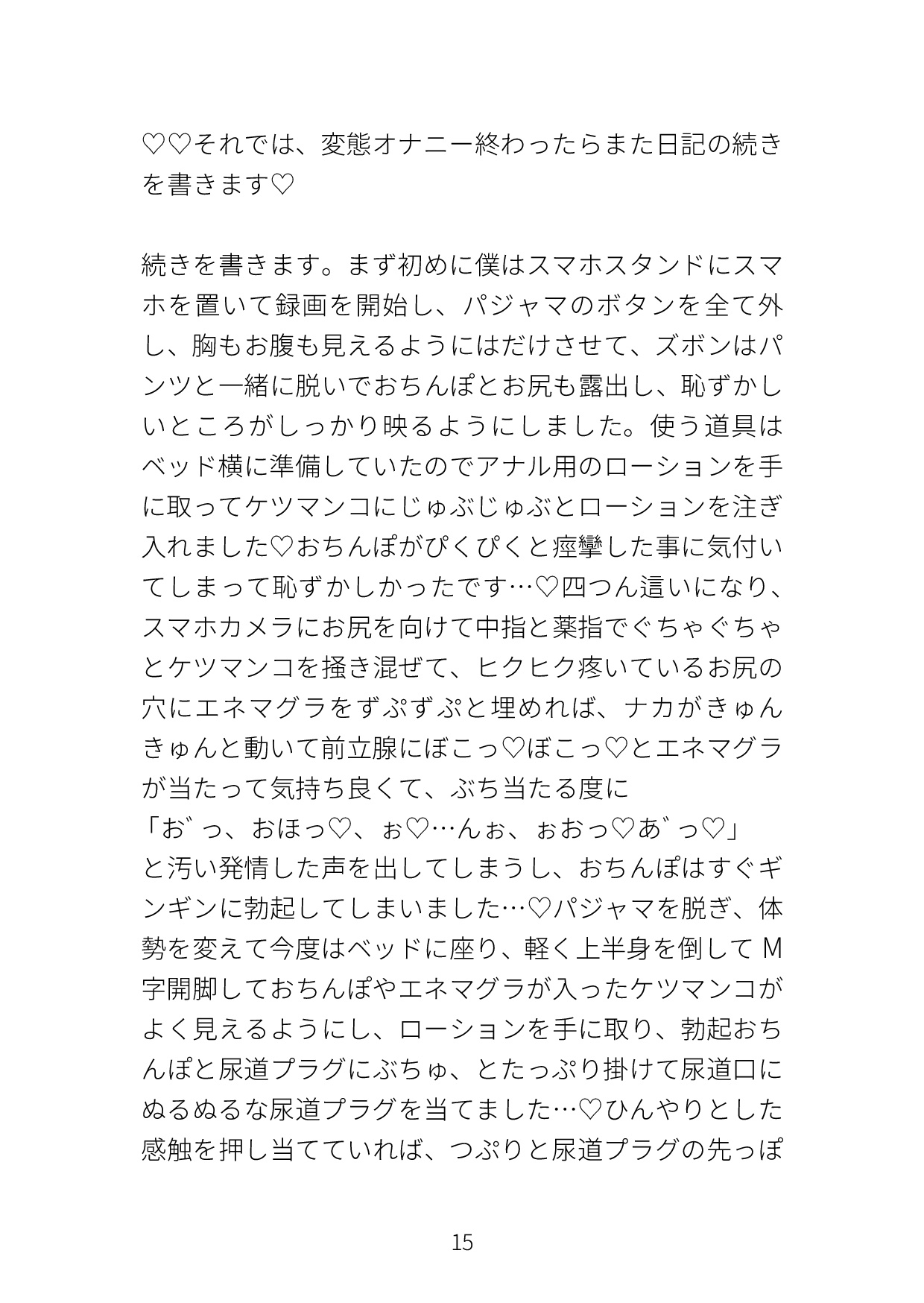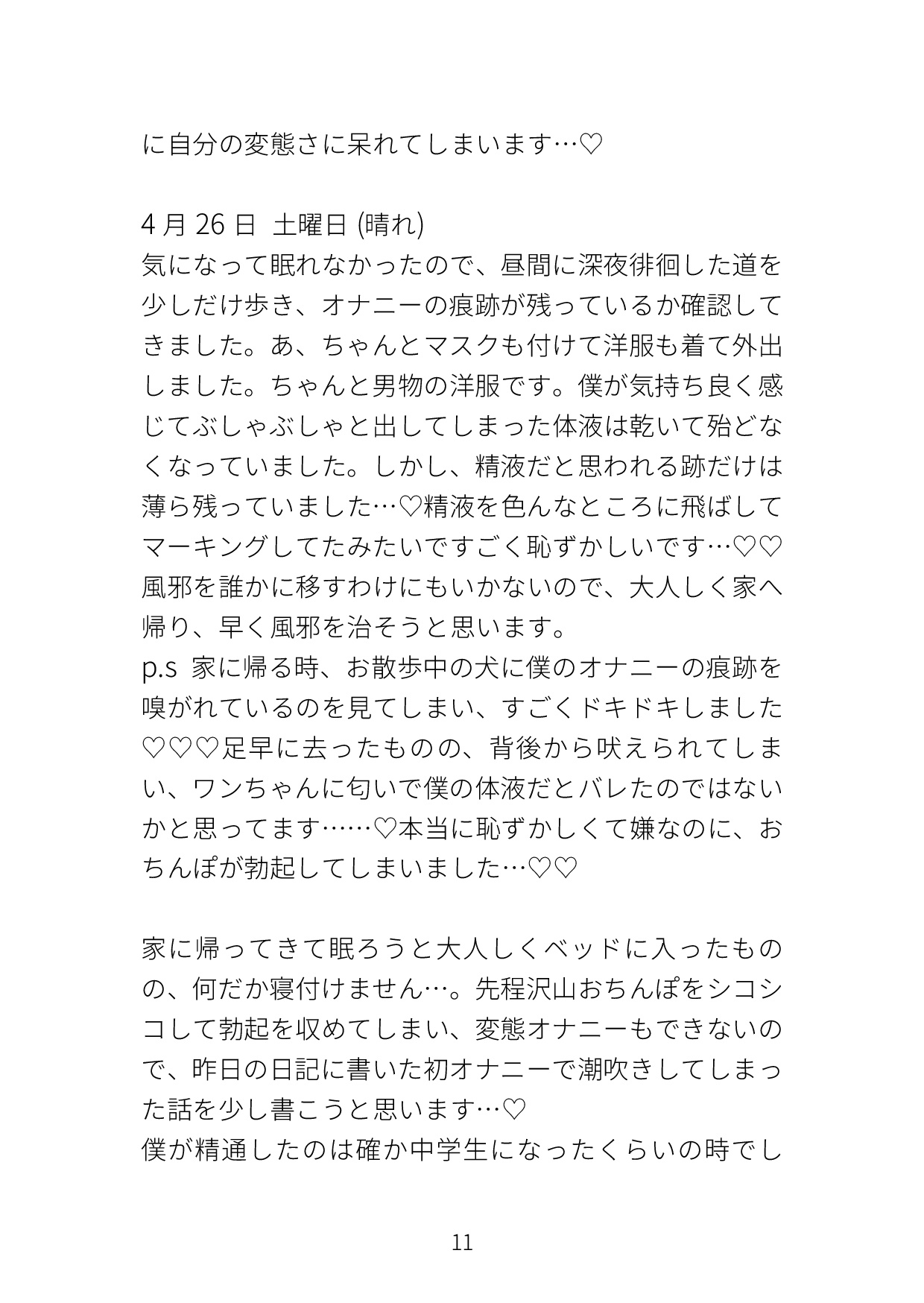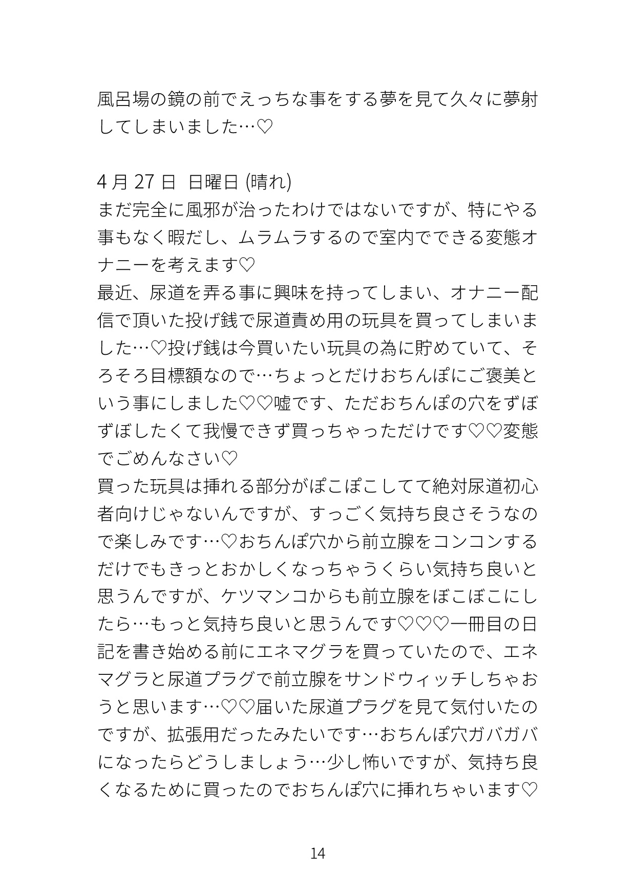 内容性癖を拗らせた青年が変態的な自慰行為を記録している日記帳です。