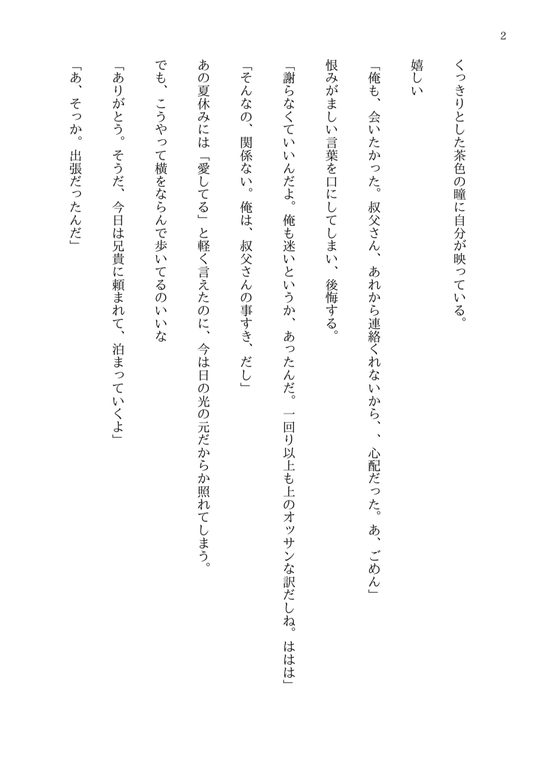 自分が酷好き過ぎなのかもしれませんが。(号泣エロシーンがたっぷり!)叔父さんと俺と夏休みの 2と対になるお話。ご馳走様です!スマホの検索履歴が罵倒で埋まっていきますが・・・。だから関係がこじれてしまった。彼が、いつの間にか好き合ってたのは嬉しい誤算でしたが、これは彼が元々主人公を好きだったのかな。