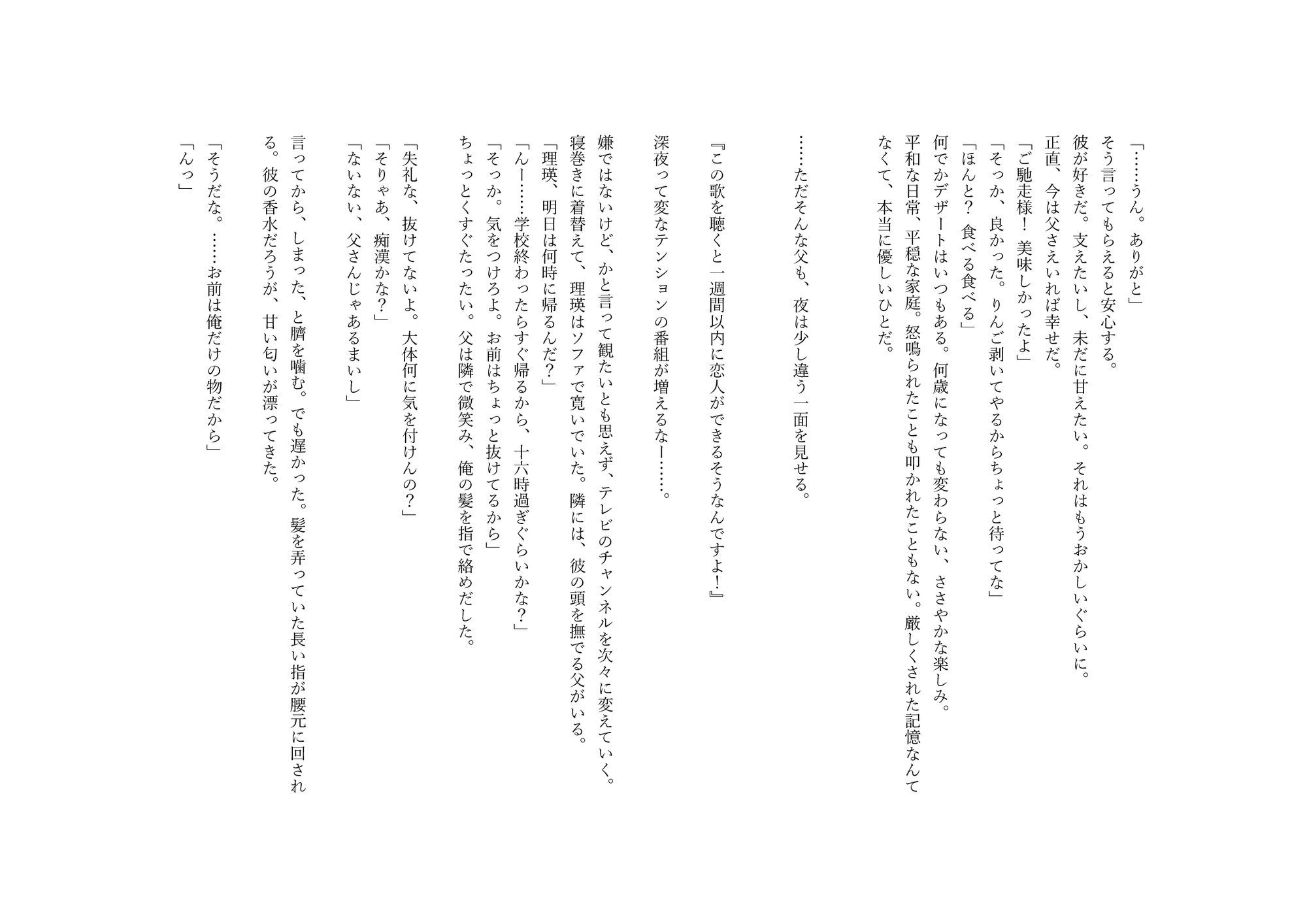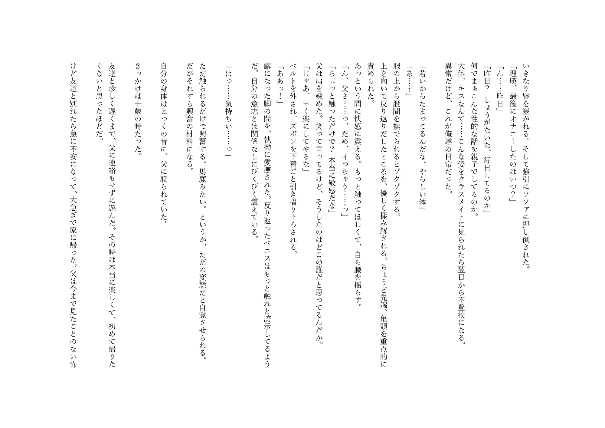 訳アリの息子(1○)を何度も調教する父親(34)のお話です。拘束、監禁、玩具、無理やり、メリーバッドエンド。ノベル形式〔約17,000字〕※女性との絡みがあります。