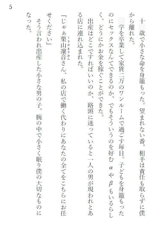 ❁登場人物・栗山凜音(くりやまりおん)Ω高校生の時番契約と妊娠させられたみなしごΩ。弓弦を育てながら水商売をする。