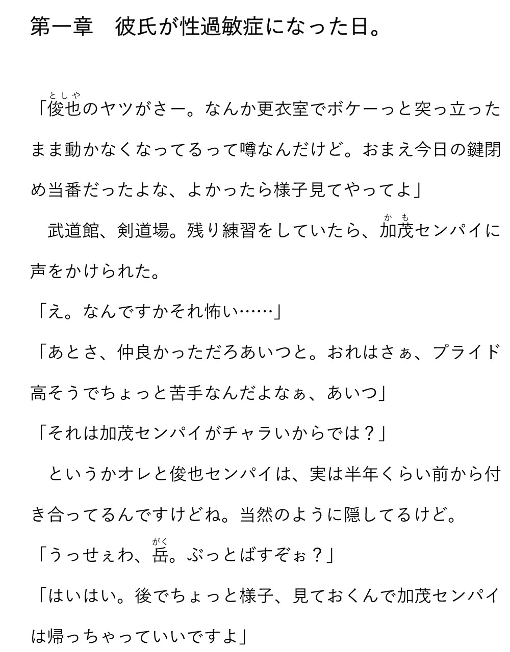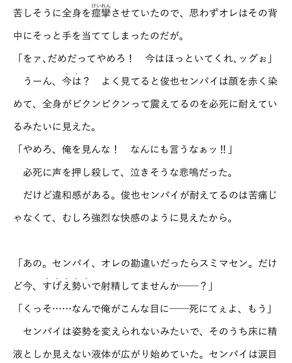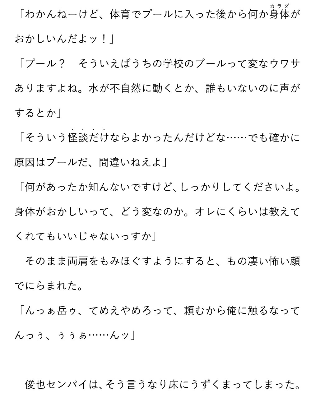 ※メイン二名は剣道部員ですが、本作は剣道といっさい関係ありません。※横書きのゴシックフォント版と縦書きの明朝フォント版が入っています。※本文はフリガナ等を抜くと17,000文字ほどです。 剣道部三年で主将をつとめる 越久 俊也(えつひさ としや)と、副主将で二年の 円殿 岳(まどの がく)は実はひそかに付き合っていたが、俊也はわりとマジメであらゆる意味で融通の効かないタイプだった。 俊也は体育の授業中、プールで泳いでいたときにある異変を感じる。それはスライム状になった物体に全身を覆われるというものだったがその後、身体にある変化が現れる。 完全に理性を侵食され、しかも全身が強烈な性感帯にされてしまっていることに俊也は気づく。そして、それは岳にもバレてしまう。 俊也の症状は収まらず、しかも感染症のように岳もまた似たような症状を発症した。その結果は当然……以降も章は続きます。