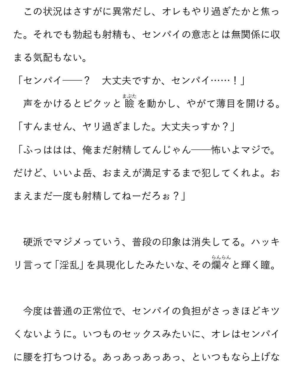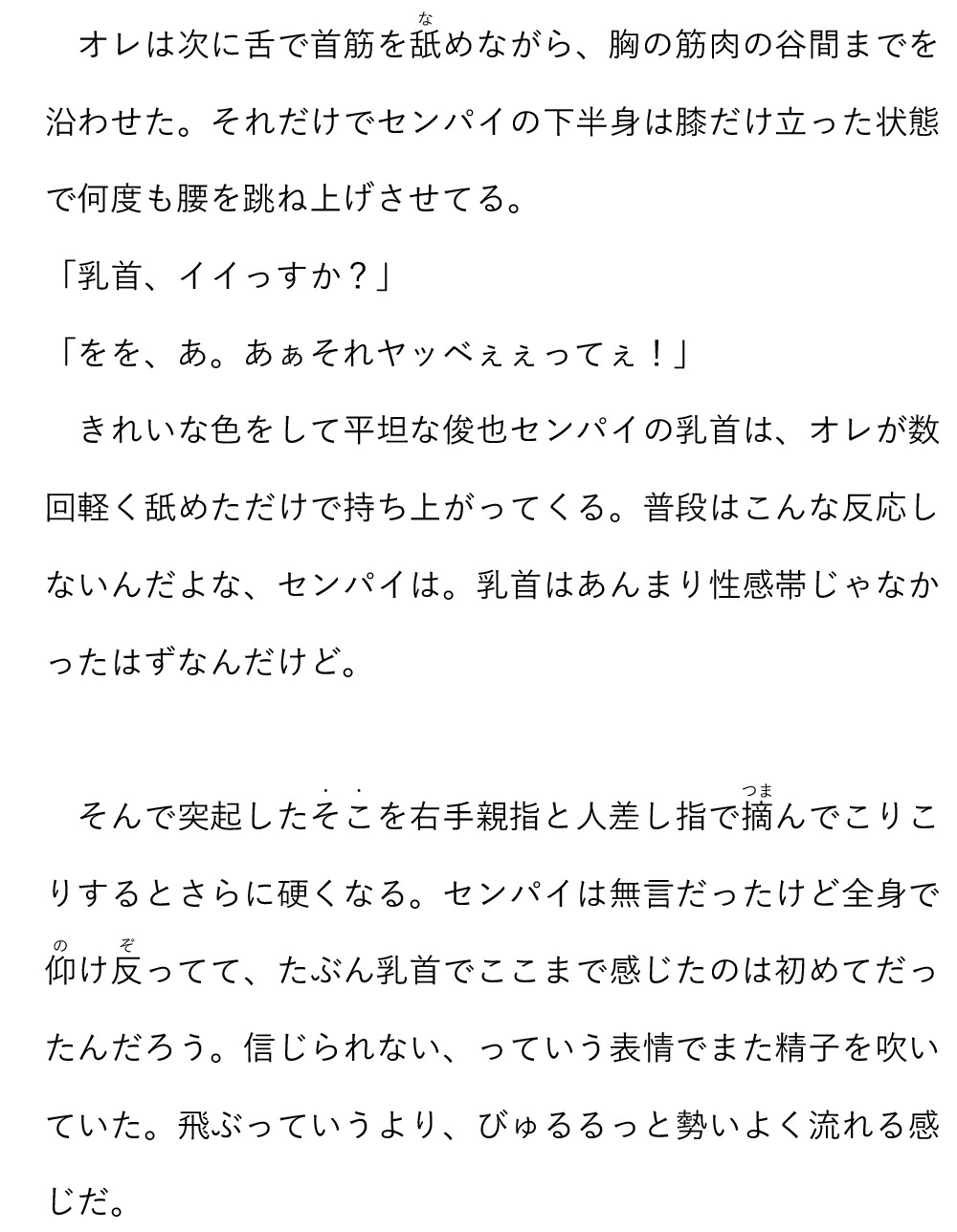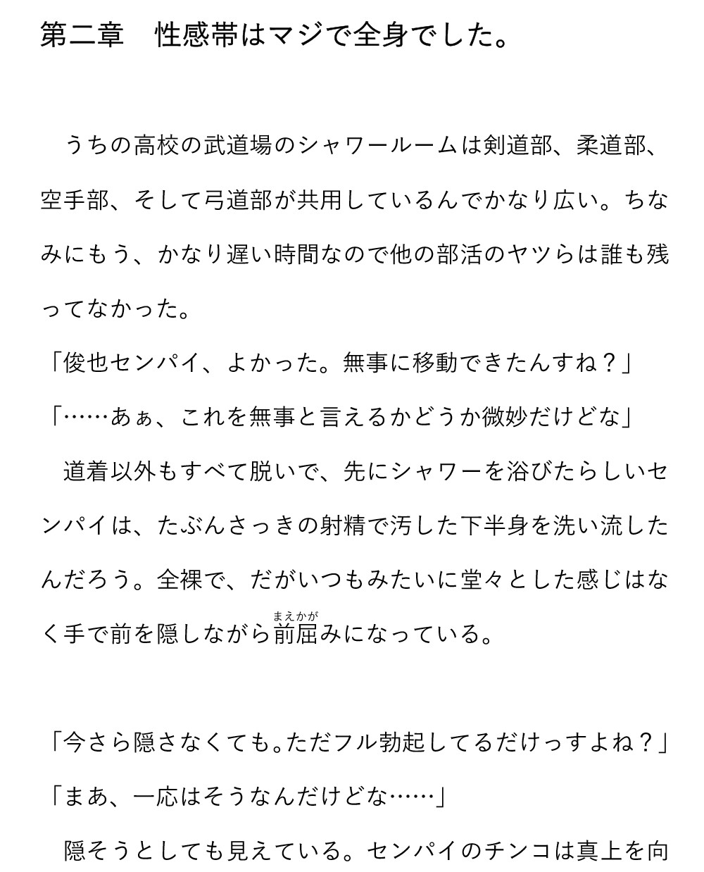 ※メイン二名は剣道部員ですが、本作は剣道といっさい関係ありません。※横書きのゴシックフォント版と縦書きの明朝フォント版が入っています。※本文はフリガナ等を抜くと17,000文字ほどです。 剣道部三年で主将をつとめる 越久 俊也(えつひさ としや)と、副主将で二年の 円殿 岳(まどの がく)は実はひそかに付き合っていたが、俊也はわりとマジメであらゆる意味で融通の効かないタイプだった。 俊也は体育の授業中、プールで泳いでいたときにある異変を感じる。それはスライム状になった物体に全身を覆われるというものだったがその後、身体にある変化が現れる。 完全に理性を侵食され、しかも全身が強烈な性感帯にされてしまっていることに俊也は気づく。そして、それは岳にもバレてしまう。 俊也の症状は収まらず、しかも感染症のように岳もまた似たような症状を発症した。その結果は当然……以降も章は続きます。