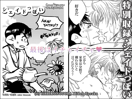 『シェイドっぽい』2004年10月10日発行幻〇水滸伝II(幻水2)に登場するカ〇ュ―×マイ〇ロトフ(略してカミマイ、赤青)の『シェイド』と一緒に発行した四コマ漫画本『シェイド』の二人による、野性100%のカ〇ュ―に愛されまくる青年マイ〇ロトフがいます。めっちゃラブラブです