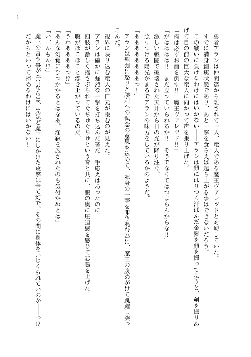 勇者アラン真面目で優しく正義感に溢れた性格。金髪青目。魔王に身体を蹂躙され、敗北してしまう。魔王真実の姿は竜人。普段は人の姿(赤髪黒目)となっている。以前から勇者を狙っており、彼を性的に蹂躙することで勝利する。