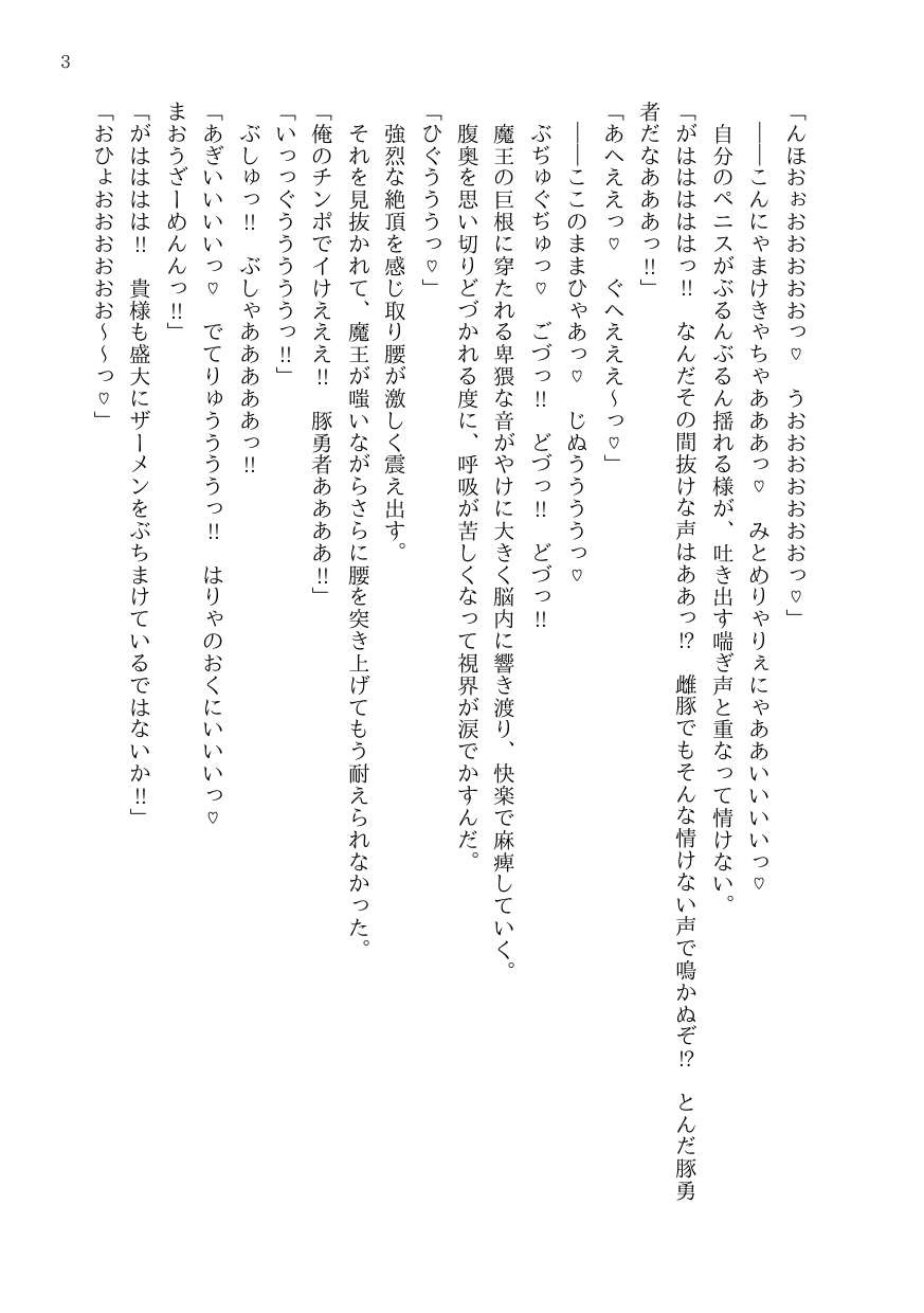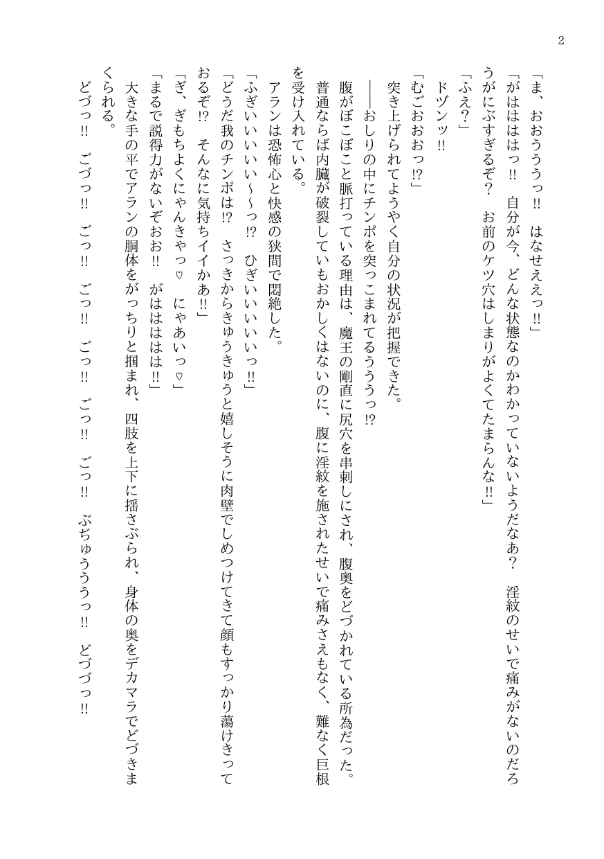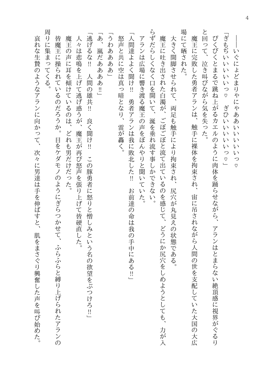 勇者アランは魔王ヴァレッドに敗北し、世界は魔族に支配された。勇者は償いの為に、世界中の人々へ謝罪をして回る事を決意。しかし魔王の許可の条件は、人間の男達の精液を飲み、魔力を体内で生成する事だった。淫紋を施され、魔王に鎖で繋がれながら仲間と共に旅に出る。