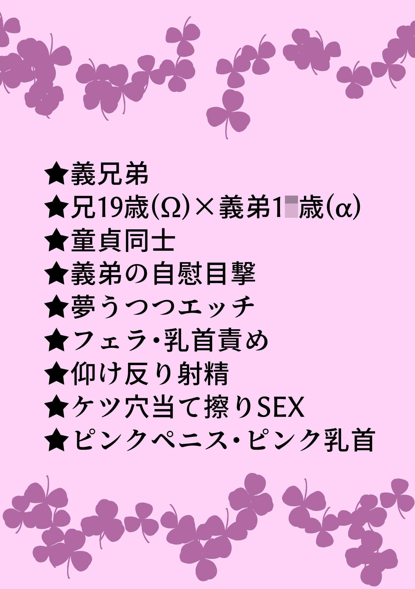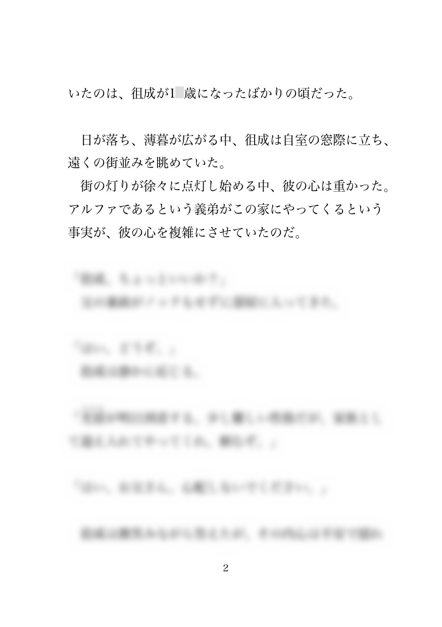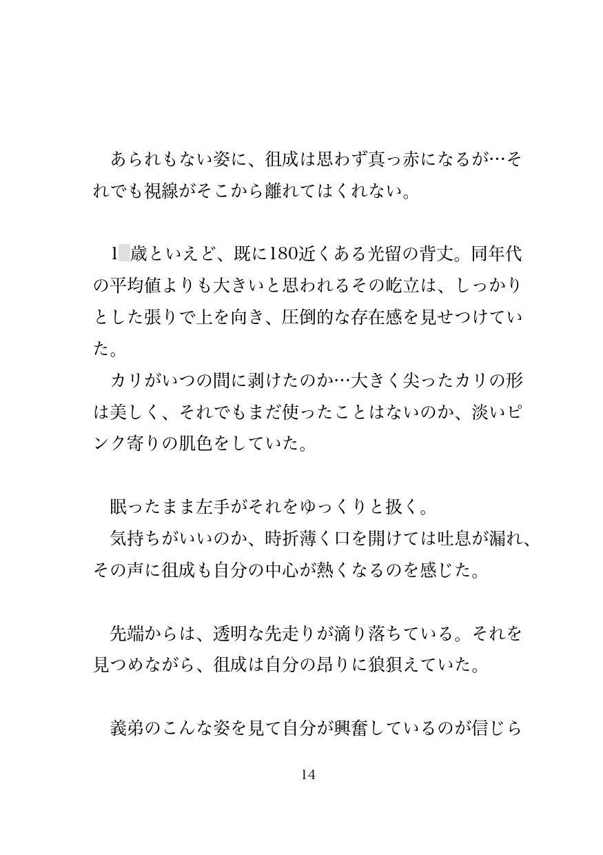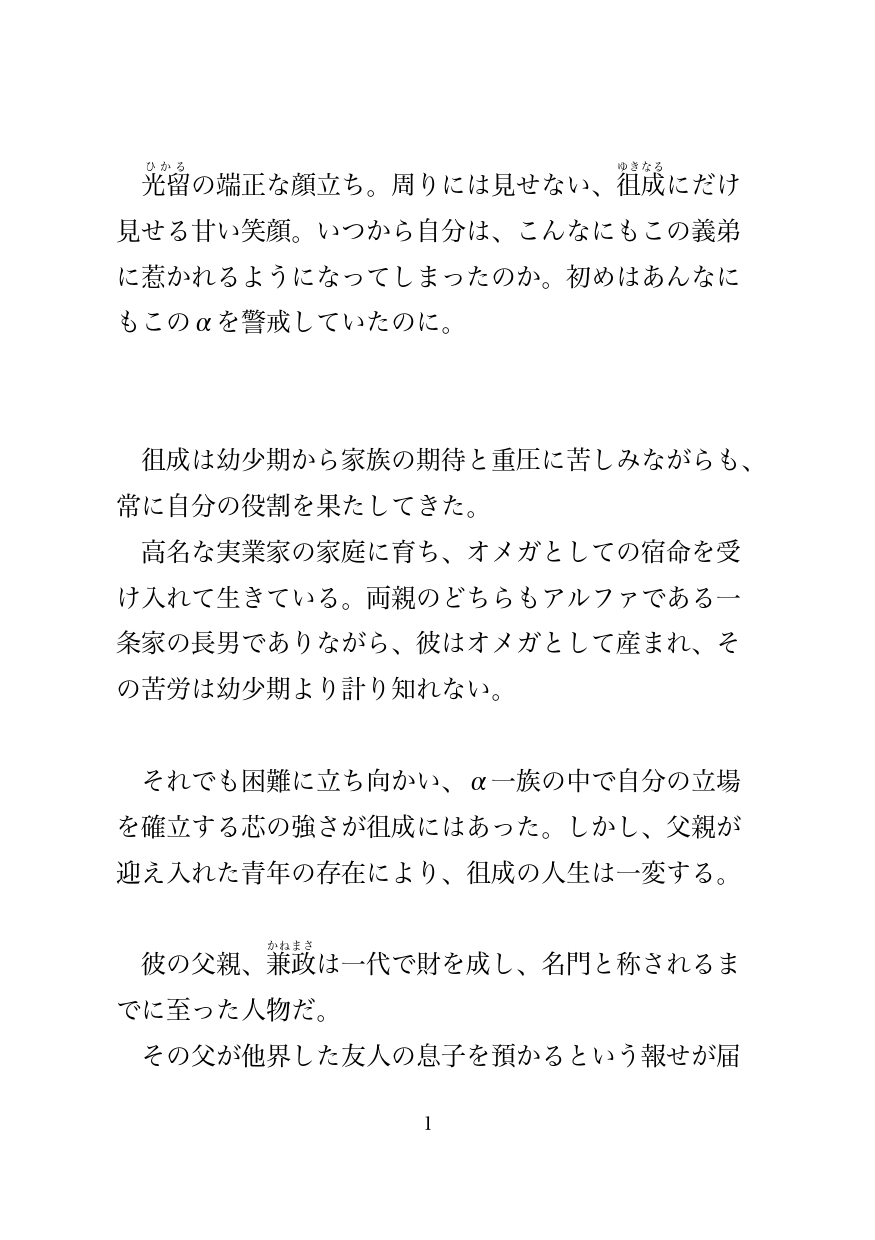 アルファ一族の中、オメガとして生まれた主人公、徂成(ゆきなり)義弟アルファ、光留(ひかる)の存在に最初は警戒するも、次第に心打ちとけていく共に暮らし二年が過ぎた頃、偶然、義弟のあられもない姿に遭遇してしまう眠りの中、兄の名を呼び、自慰を始める光留その姿に、えも言われぬ興奮を覚える徂成頭では警笛が鳴っているのに…義弟の立ち上がったペニスに引き寄せられる自分に抗えない