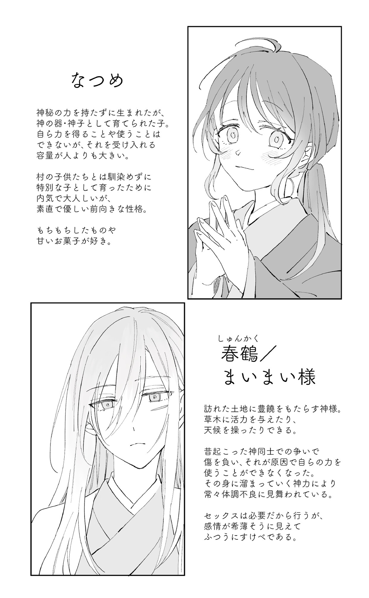 今は失われつつある神秘がまだ残っているこの国には、様々な神様と、神様から授かった不思議な力を扱える人々がいた。とある村に生まれた少年なつめは神秘の力を扱うことはできなかったが、その神秘の力を『受け入れる器』の容量が尋常ではなく大きい子だった。古くから村に伝わる豊穣の神・まいまい様は、とある理由から自らその力を使えず、力を貯め込むばかりで苦しんでいた…。