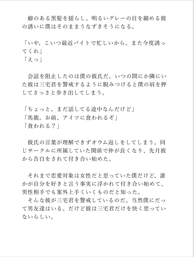 彼氏と穏やかに過ごしていた青年は、やたら構ってくる友人がいた。友人の誘いに乗って家までついていくと眠らされてしまい、起きた時にはすでに挿入されていて……。「どうして君は覚えてないの。思い出してくれないの。俺だけしか知らないなんて耐えられない」抵抗する間もなく与えられていく快楽と、彼氏を裏切りたくない思いに葛藤する青年。しかし友人は容赦なく追い込んでいく。