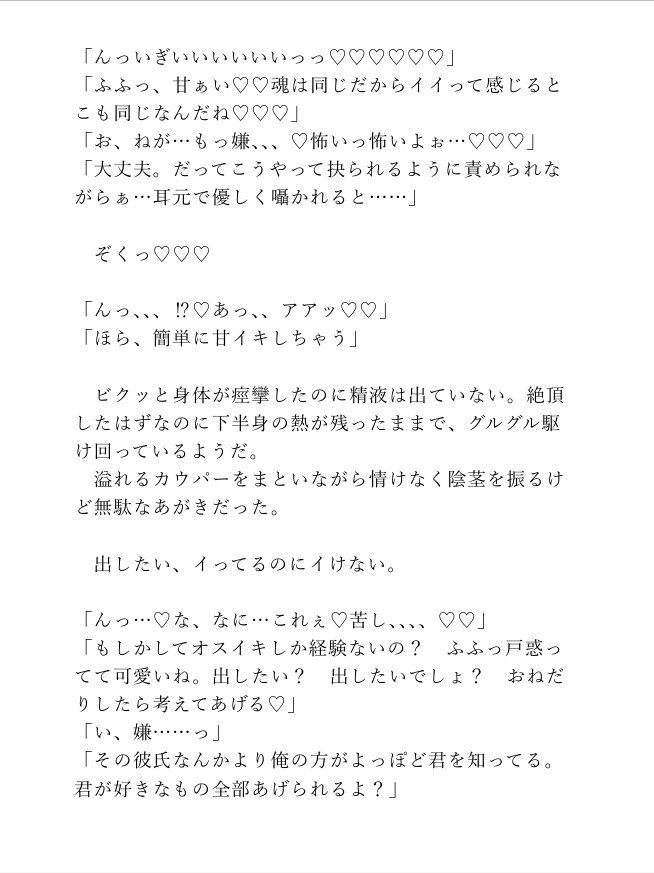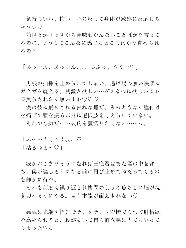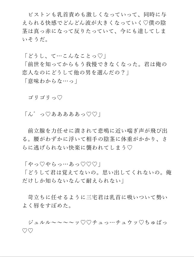 悪戯に先端を指先でチュクチュク撫でられて射精欲を高められると、腰が動いて自ら前立腺に当てにいってしまった。「収縮すっご。俺のちんこを締め付けてオ〇ニーしてるの? 卑猥だなぁ」 「うっ……はあっ、あへっ……」 酷いこと言われてるのに腰が止まんなくて、アヘアヘしながら気持ちいいところを擦り続ける。これじゃ自慰だ。しかも恋人でもない男の肉棒を咥えて喘ぐなんて、、、 ・乳首責め・寝取られ・寸止め&焦らしプレイ