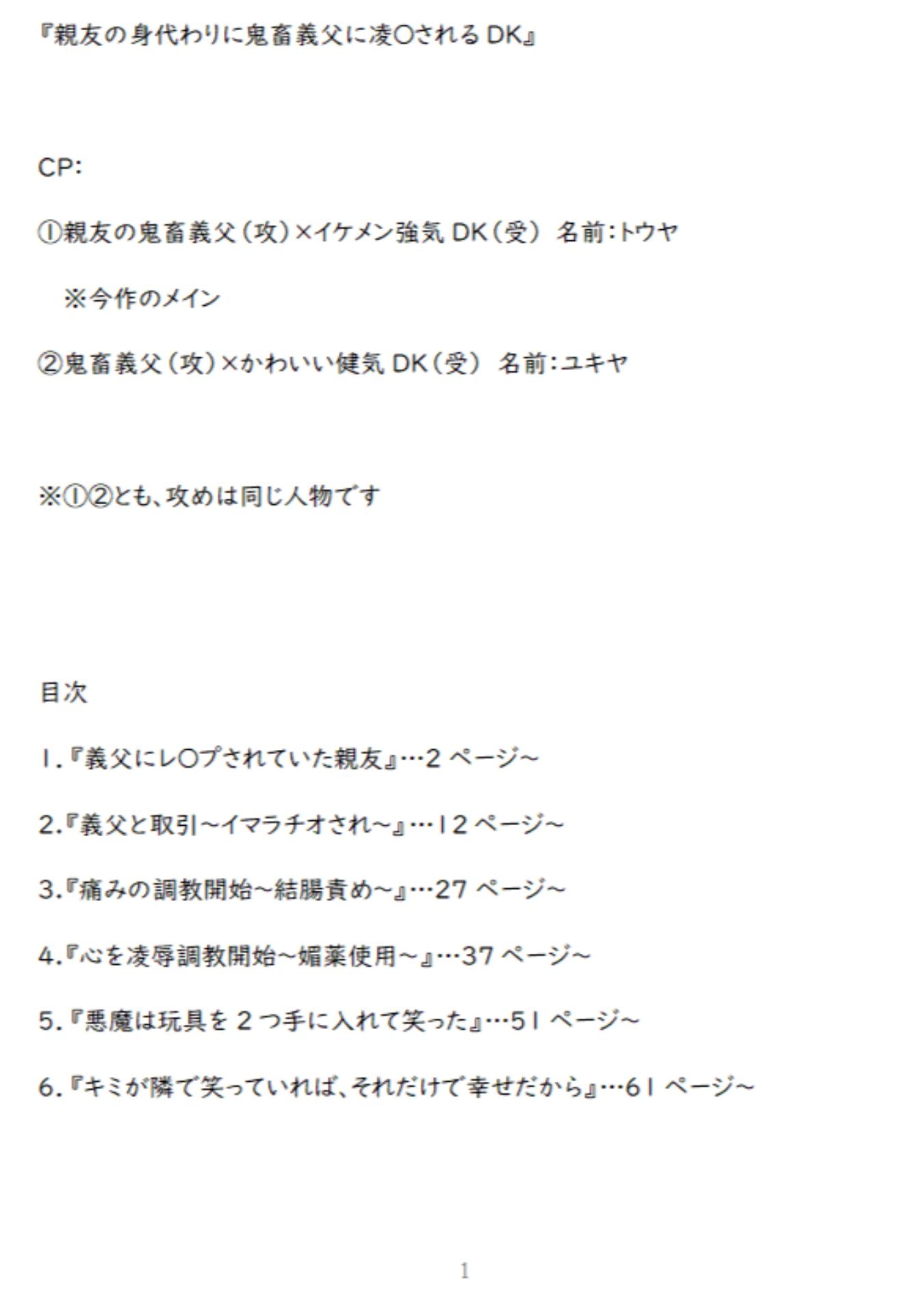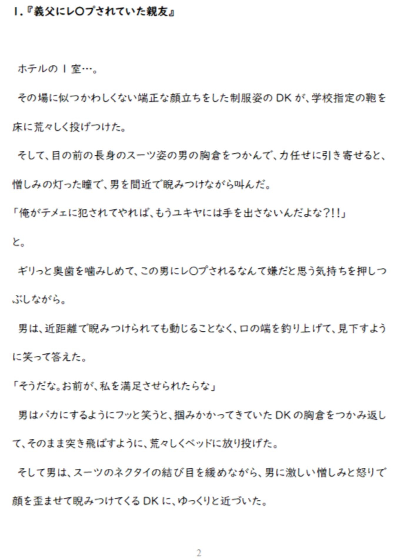 【こんな人にオススメ】〇小説だからこその、細かなエロ描写をお好きな方〇イケメン強気受けが、痛みや快感に屈しないよう耐えているのがお好きな方〇かわいい健気受が泣いている(泣かせる)のがお好きな方(今作は健気受けは一部)〇徹底的な鬼畜ドSな攻めが好きな方〇好きな人の為に身代わりになる受けが好きな方〇凌○・調教・屈辱・無理やり等がお好きな方 1.『義父にレ〇プされていた親友』