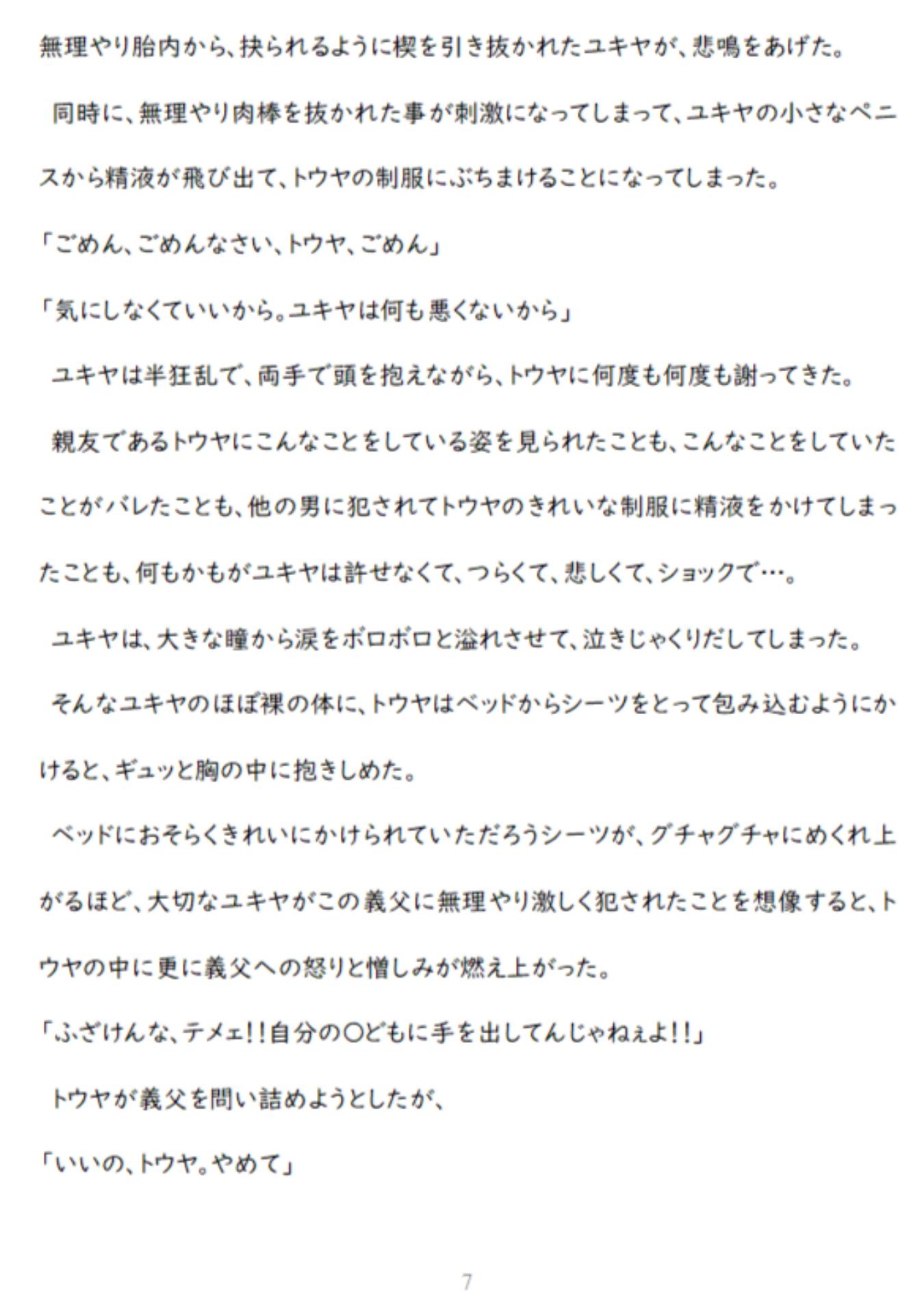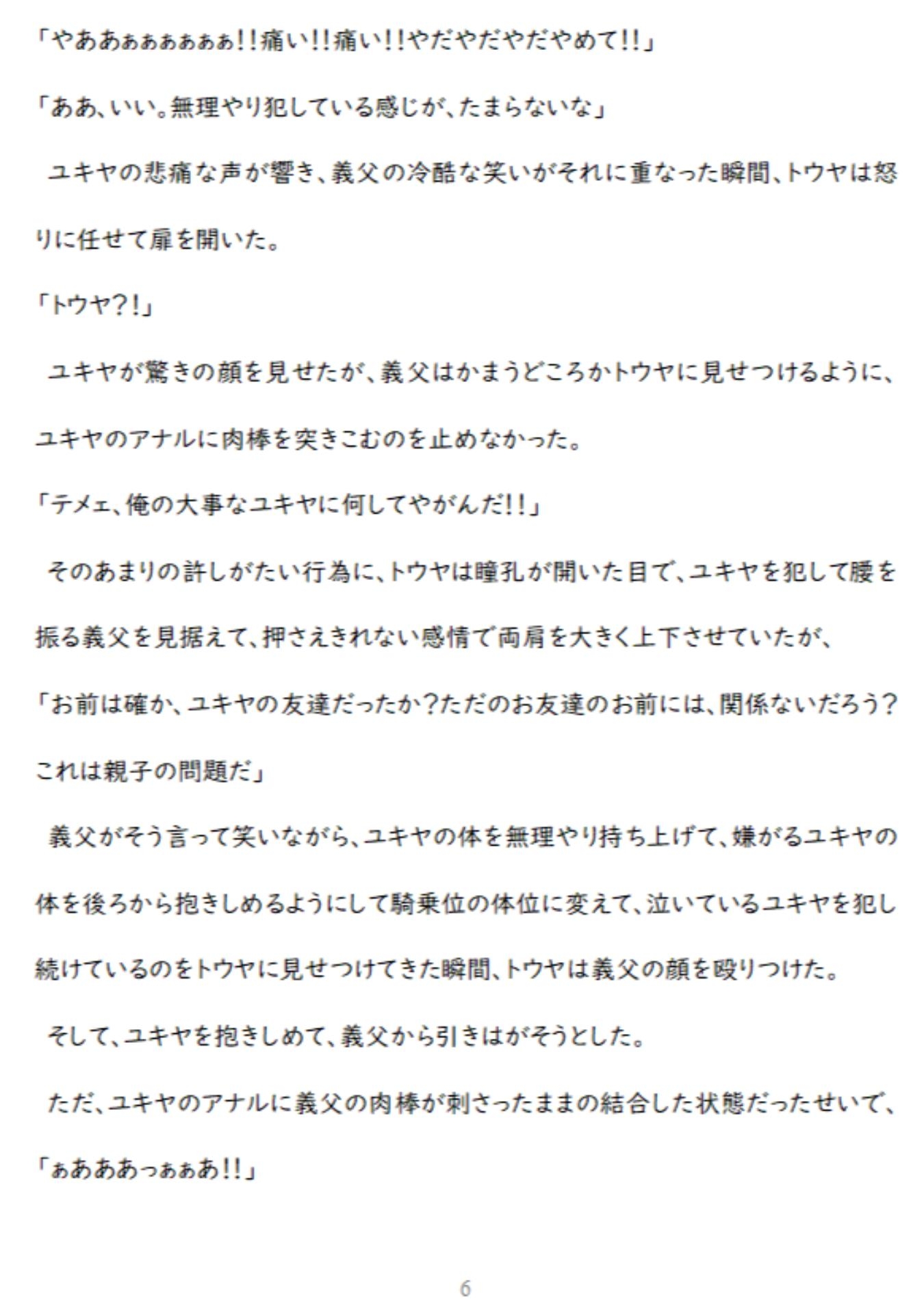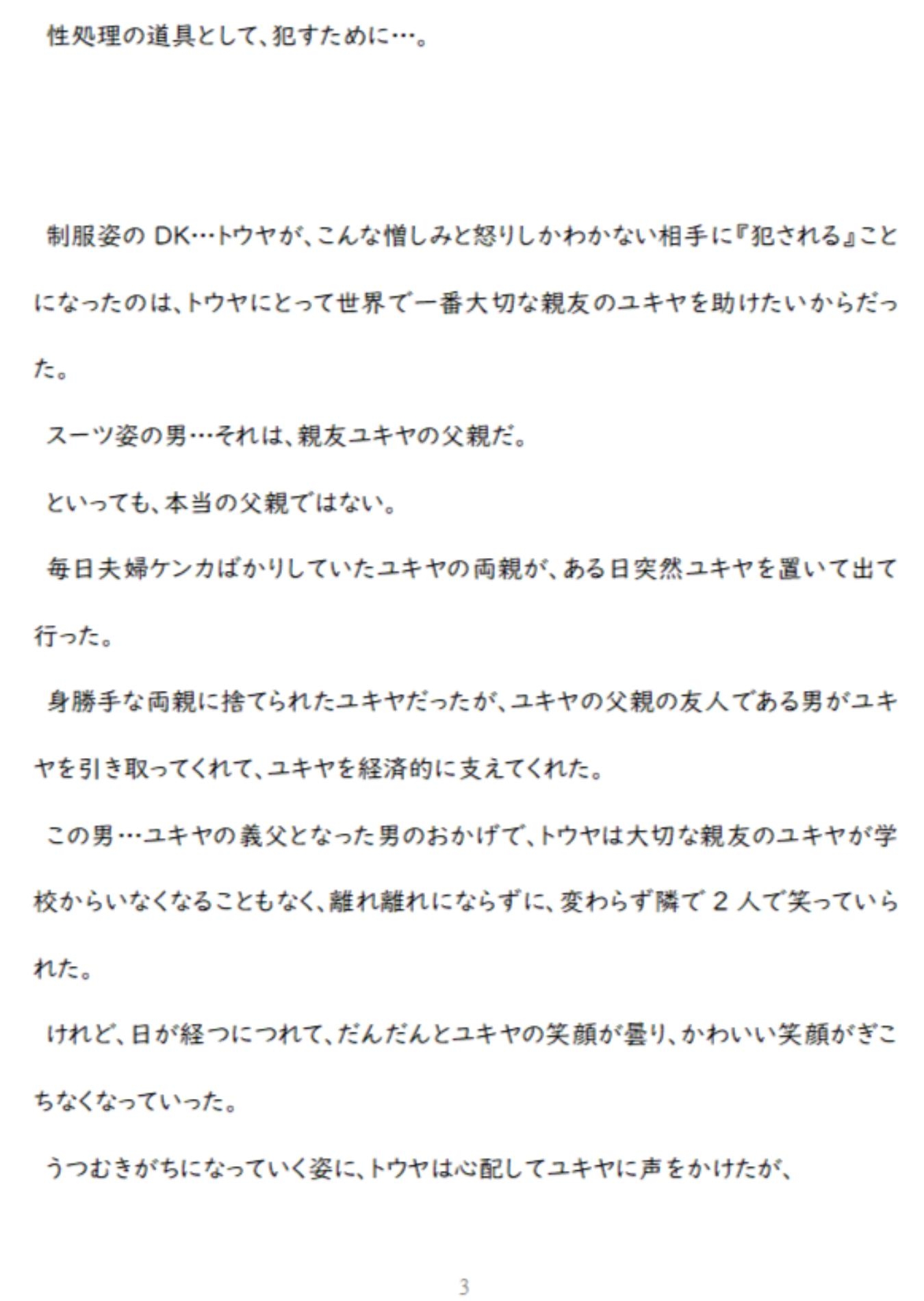 【あらすじ】世界一大切な親友(ユキヤ)が、義父から無理やり犯されているのを見てしまったトウヤ。トウヤは、「自分を好きに犯していいから親友には二度と手を出すな」と、義父に取引を持ち掛ける。レ〇プ好きな義父からの凌○に、トウヤ(強気受け)は「絶対に心だけは屈しない」と思いながら、処女喪失のアナルセックスで結腸まで開かれ、媚薬を使われ、徹底的な屈辱のアナルセックスに耐え続けるが…。