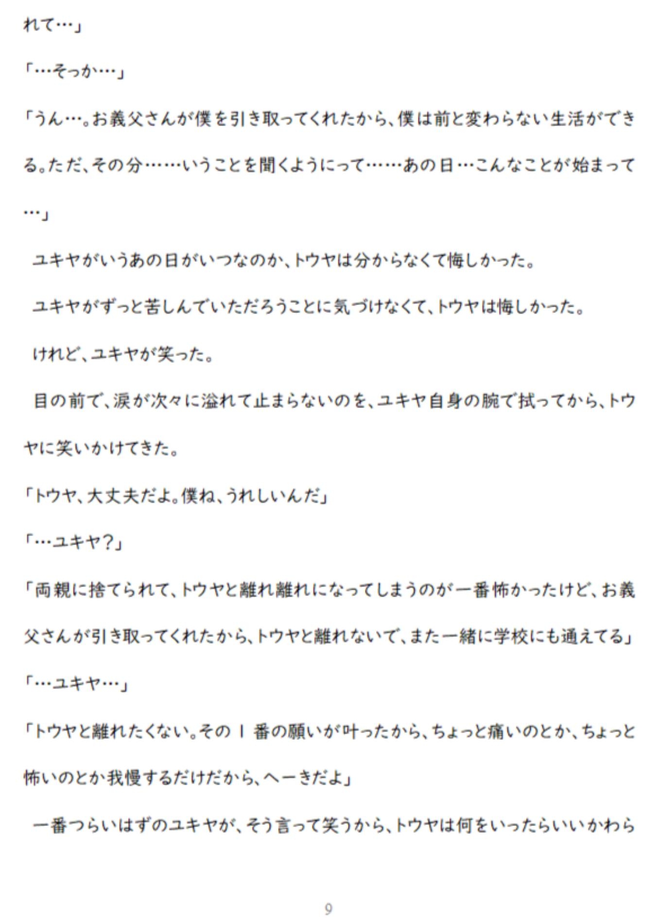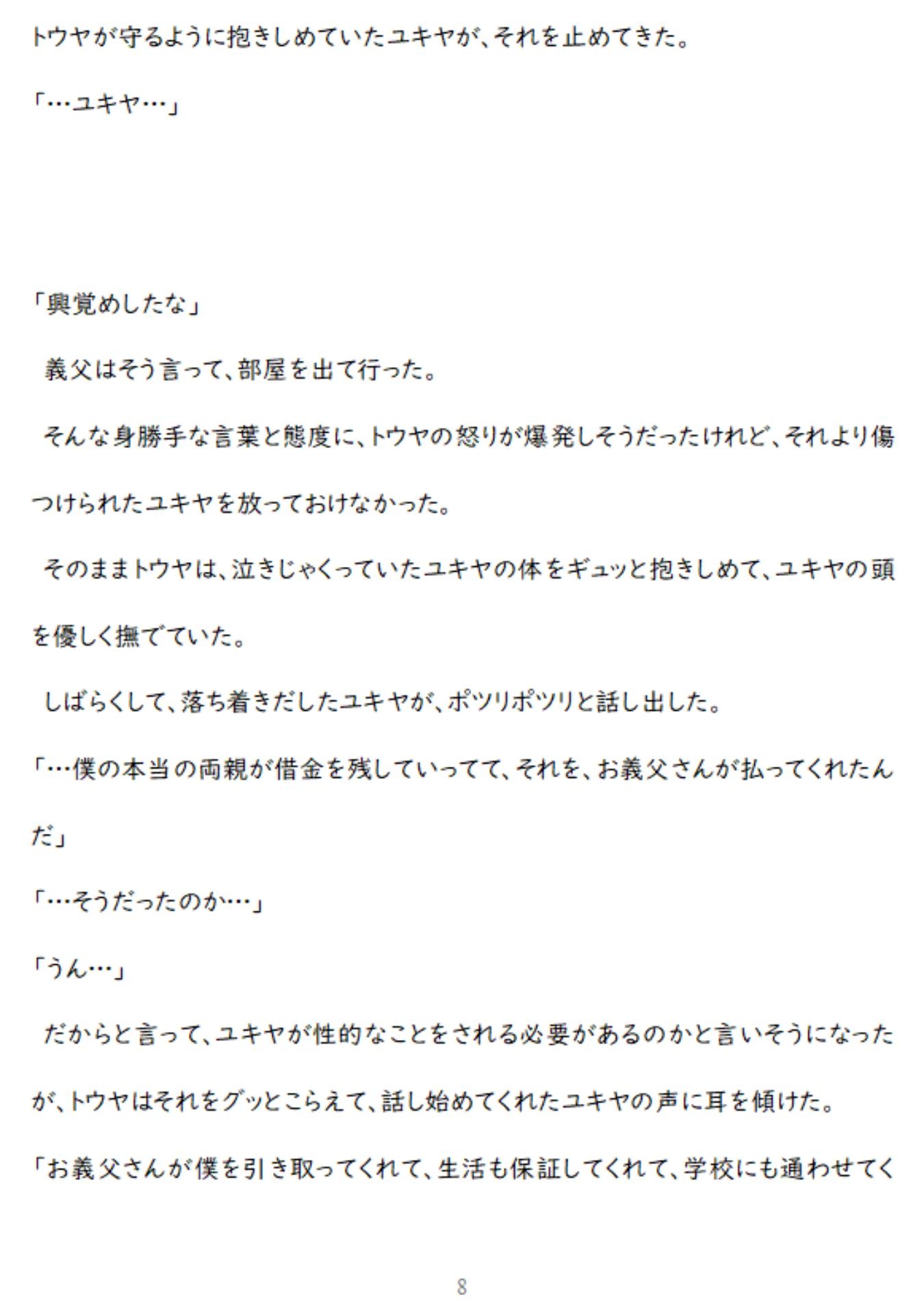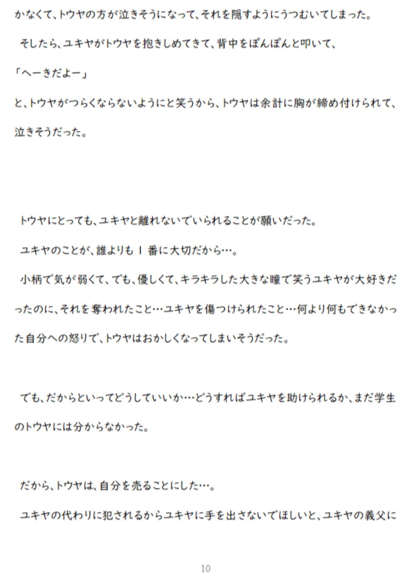 【あらすじ】世界一大切な親友(ユキヤ)が、義父から無理やり犯されているのを見てしまったトウヤ。トウヤは、「自分を好きに犯していいから親友には二度と手を出すな」と、義父に取引を持ち掛ける。レ〇プ好きな義父からの凌○に、トウヤ(強気受け)は「絶対に心だけは屈しない」と思いながら、処女喪失のアナルセックスで結腸まで開かれ、媚薬を使われ、徹底的な屈辱のアナルセックスに耐え続けるが…。