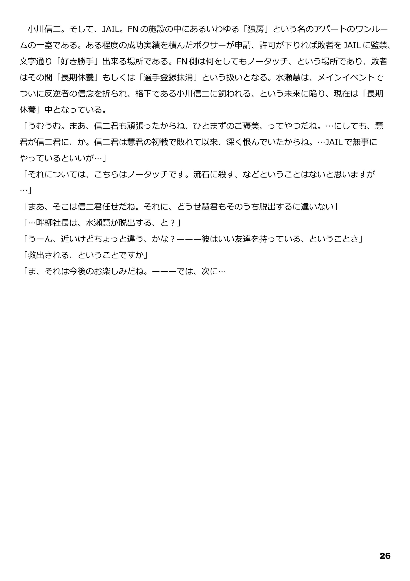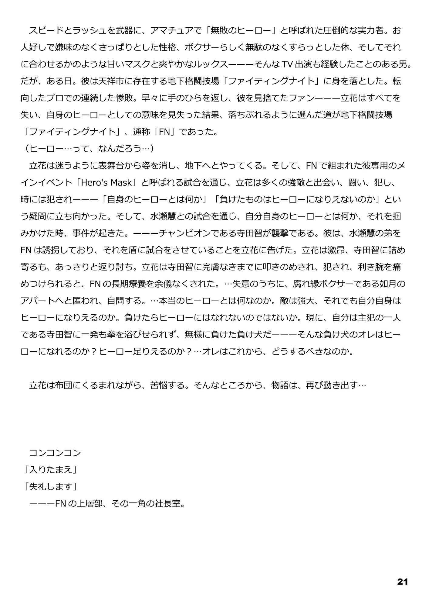 ーーーーーーーーーーーーーーーーーーーーーーSho Tachibana was an undefeated hero in the amateur ranks. He became a professional fighter, but after a series of defeats, he became a loser and moved to FN... He met Yuki Kisaragi and Kei Minase, and was in the process of finding his hero... when suddenly, Tomo Terada, the one who brought Tachibana to FN, attacked him. Suddenly, Tomo Terada, the man who brought Tachibana into FN, attacks. He says, “I'm taking care of Minase Satoshi's brother. He has no choice but to fight here! Tachibana, enraged, attacks Tomo Terada, but is beaten back. ---What will Tachibana think now that he has once again become the underdog? And what about the shadows of the past that are coming back to haunt Tachibana and her friends?