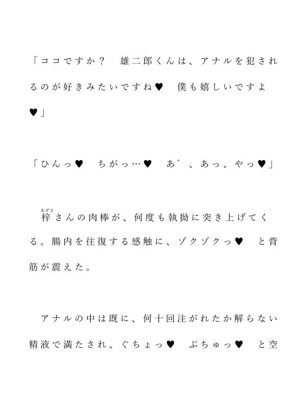 催淫効果に苦しんで長次郎くんを求める与助くんの乱れっぷりがエロい。 3Pと言っても、1人はイラマだけで、挿入(攻!)は終始同じ人物。 今回もエロ可愛い2人を堪能させて頂きました!