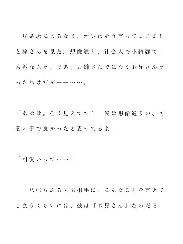 正直残念な気持ちもあったけど、中身は仲良しの梓さんなわけで。オレはすっかり彼と仲良くなりたいと思いながら、初めてのオフ会を楽しんだ。