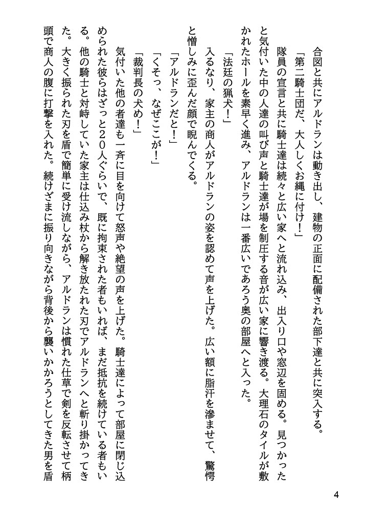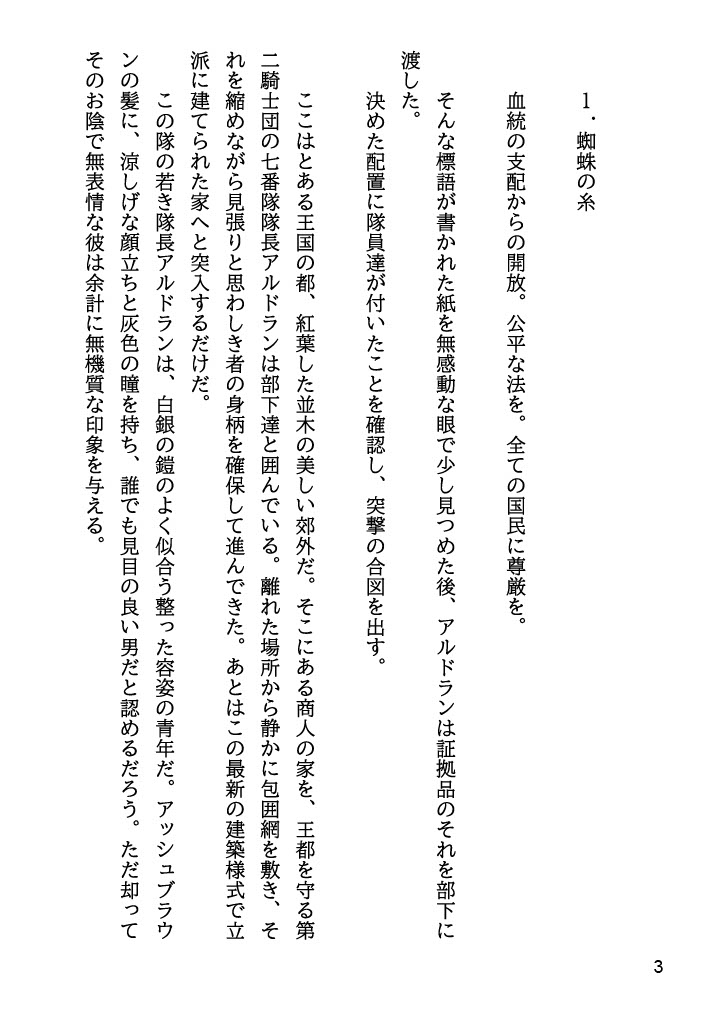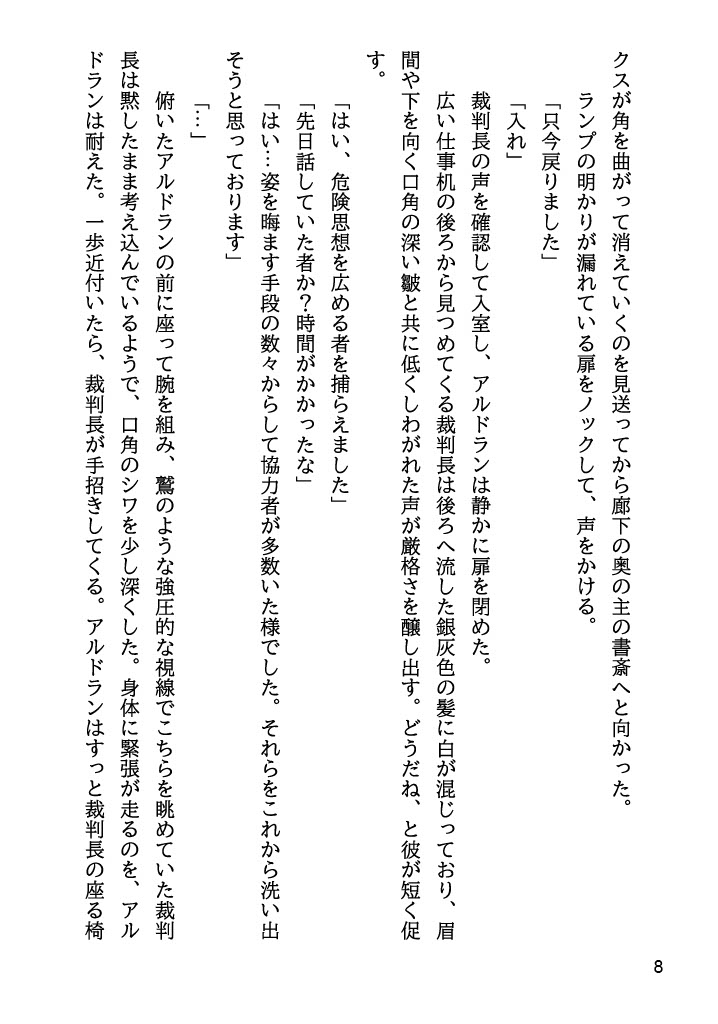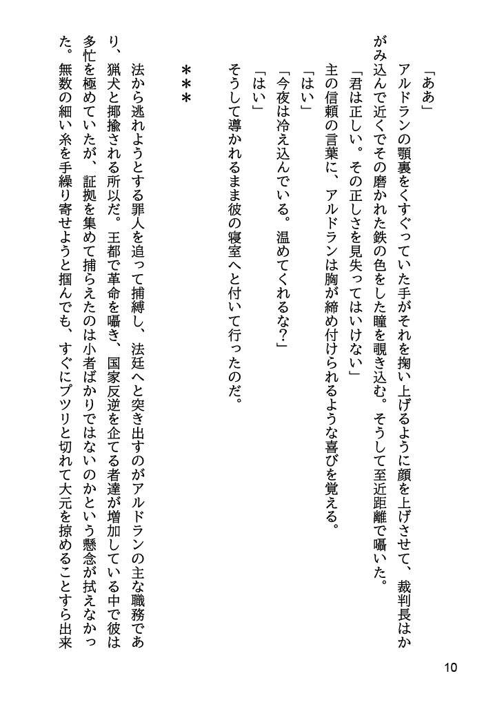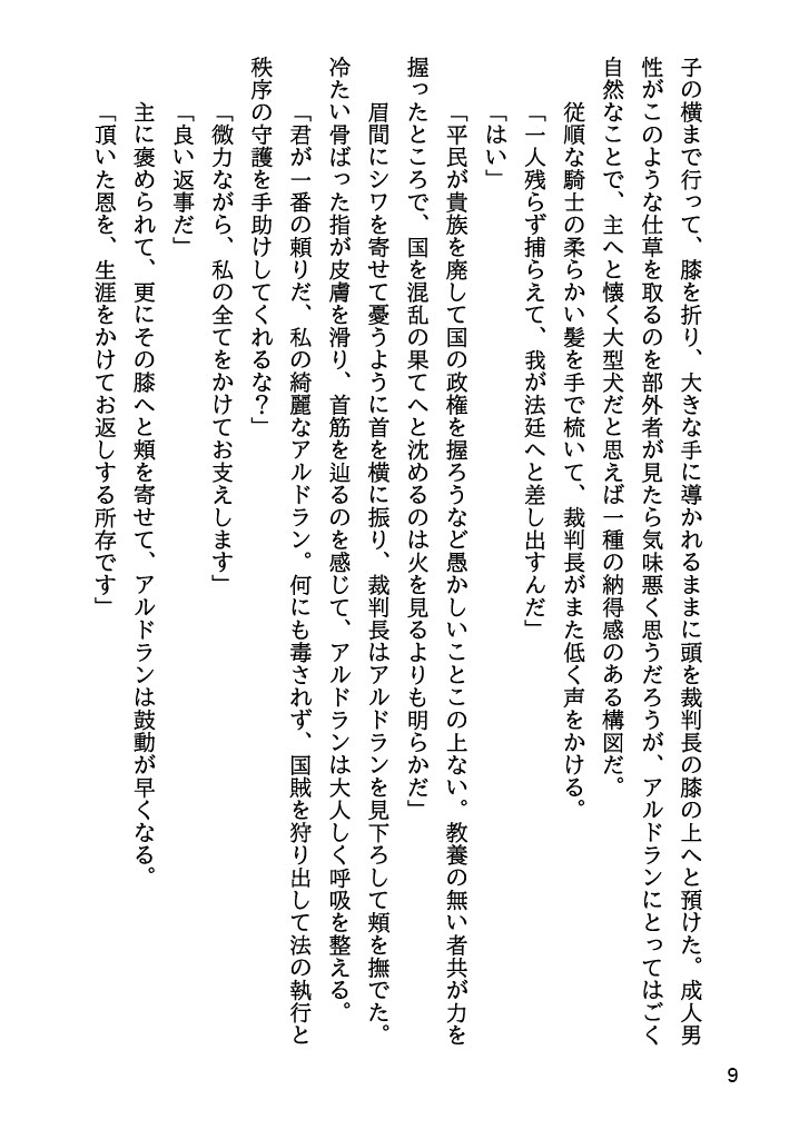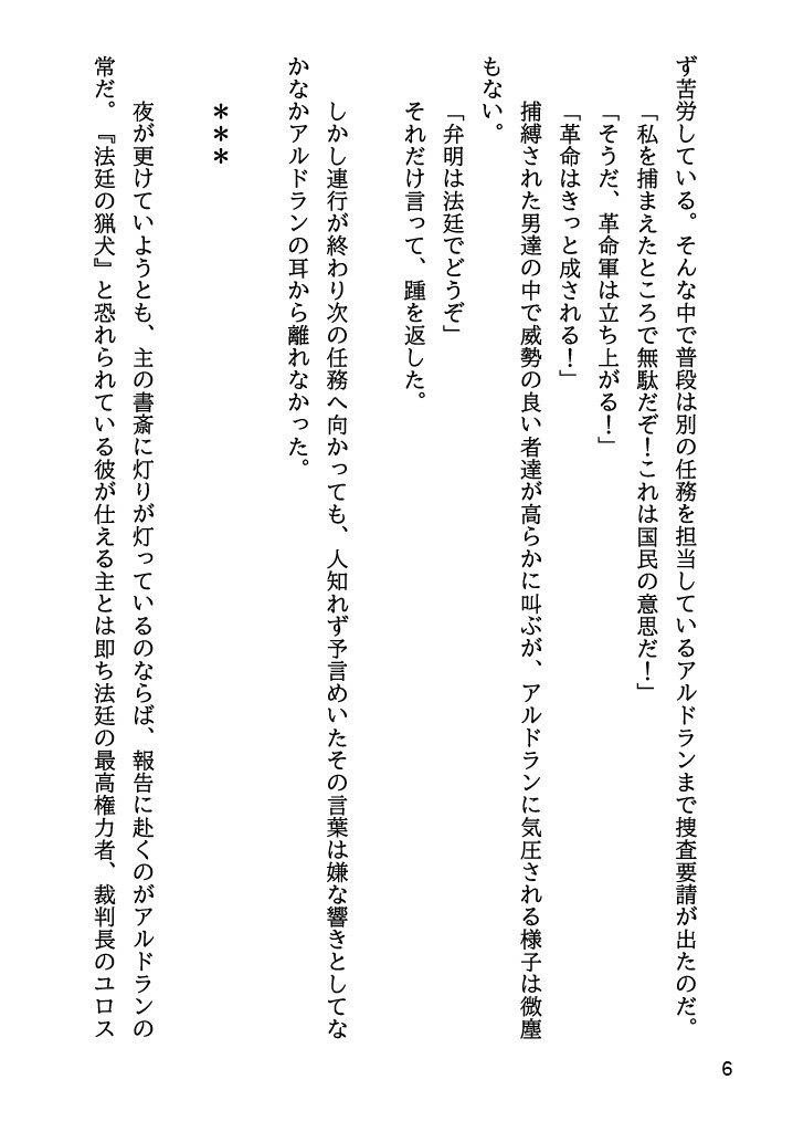 メインカップルは年下攻めのロワンと襲い受けのアルドランですが、受けが他の男に抱かれるシーンが含まれます。受けが身体的にも心理的にも可愛そうな目に遭う場面も。親子丼要素も。革命が起きている設定上処刑のシーンがありますが、短いです。全体的に暗めですが最後は明るい。 アルドラン(受け)『法廷の猟犬』と恐れられている騎士隊長。複雑な生い立ちを背景に持ち、裁判長であり伯爵でもある主に絶対的な忠誠を誓って、貴族が牛耳る法廷の為に罪人を追う。無表情で冷たいが実は生真面目で責任感が強く、房事となると豹変することも。貴族の力の一つとして革命軍に捕まり、多数の怪我を負った状態でロワンと出会うが、裁判長の安否を懸念している。