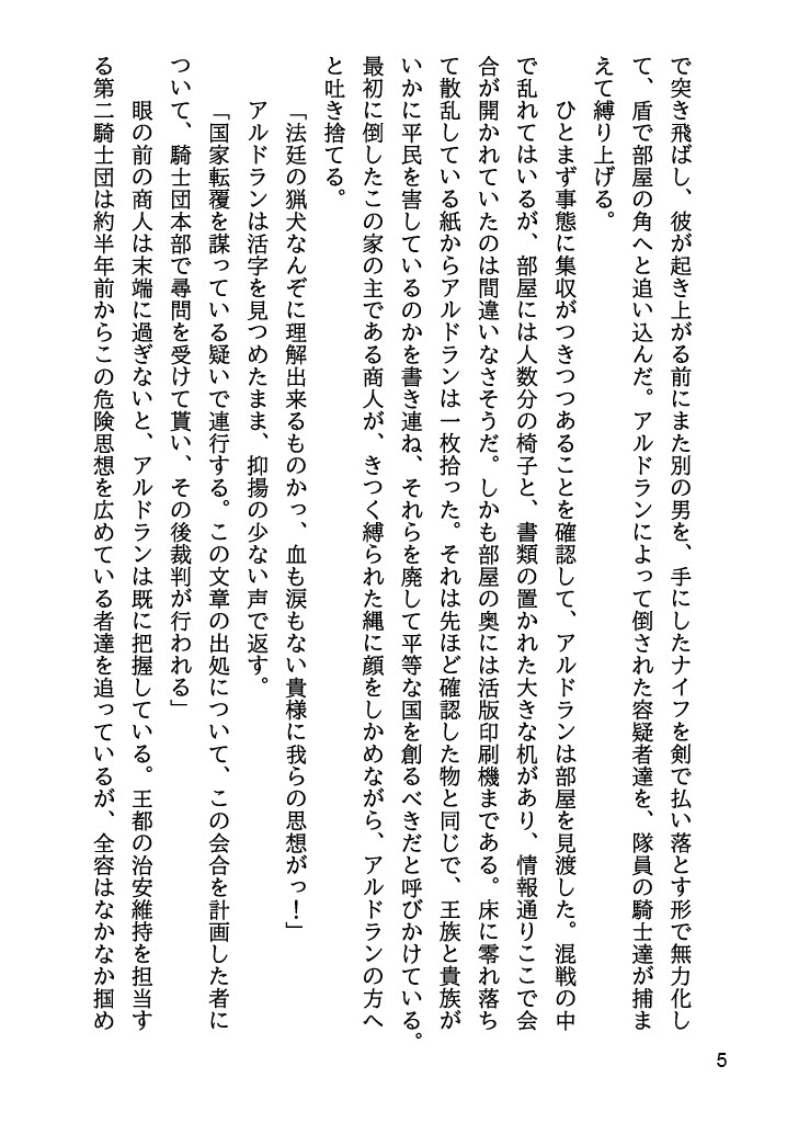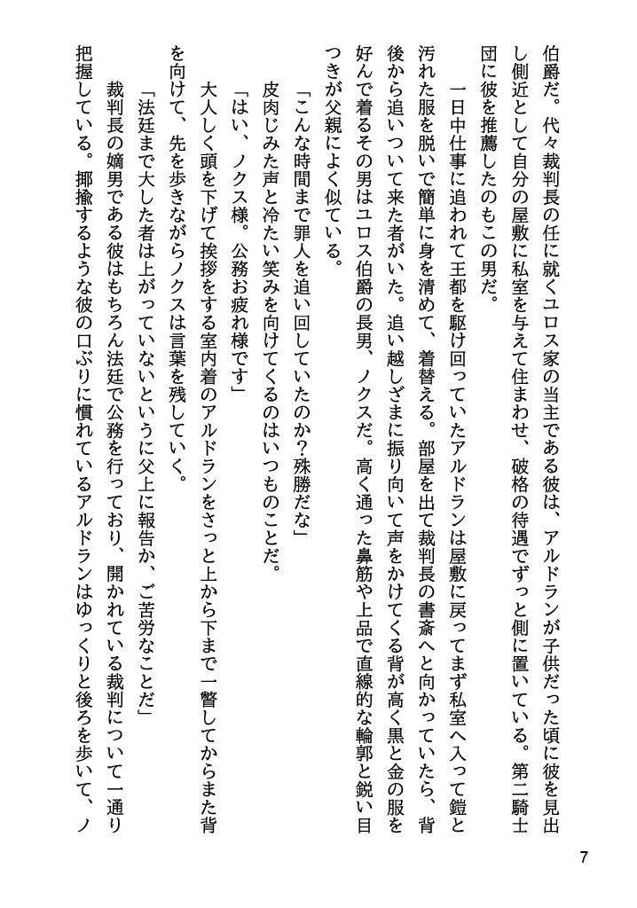 ロワン(攻め)下町で小さな診療所を営む若い医者。貴族のせいで子供の頃両親を失い、幼い妹の面倒を見ながらなんとか自分の家を持てるまで頑張ってきた。貴族と法廷を恨んでいて、怒ると口調が荒くなるが、若い割には冷静な青年。昔自分の親を偽りの裁判へと連行したアルドランを治療することになるなんて酷い皮肉だと思っているが、少しづつ彼を知っていく中で心境の変化が起こる。