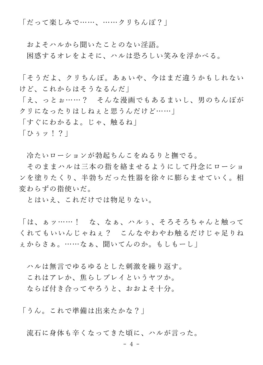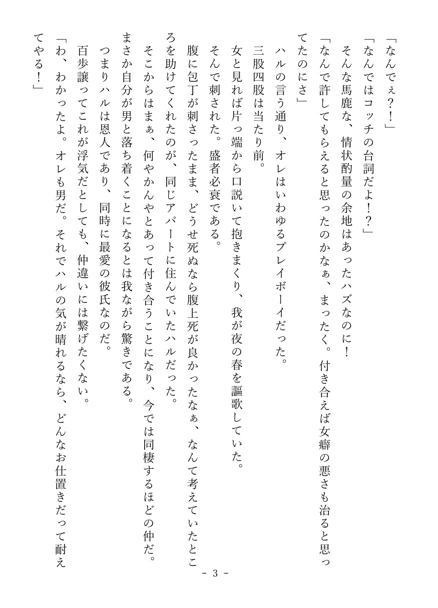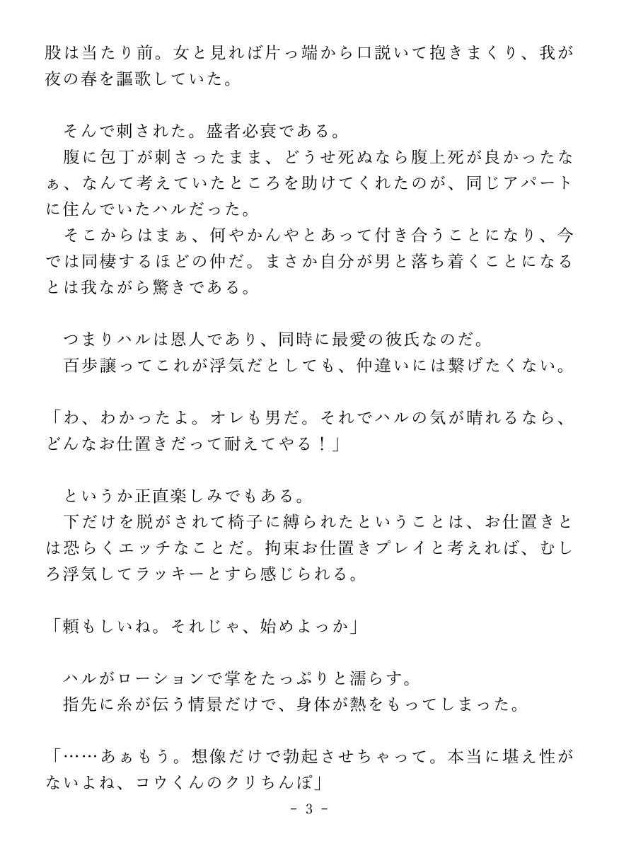 浮気癖の治らないヤリチンプレイボーイくんが、ブチギレ彼氏に快楽調教されるお話です。亀頭をクリより敏感になるまで磨いてみたり、玩具をぶち込んだまま放置したり、メス化した身体をじっくりたっぷり堪能したり――プレイボーイくんが二度と女の子が抱けないメスに堕ちる様をお楽しみください。