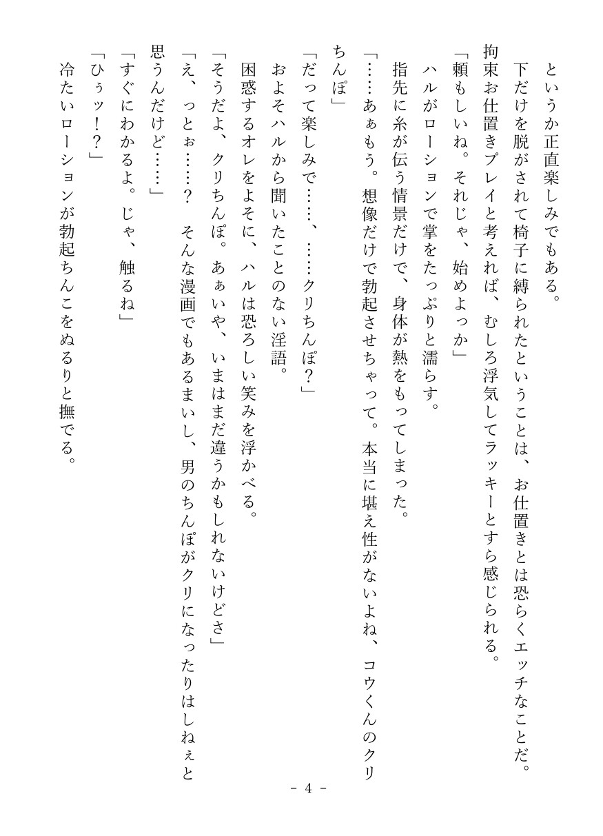 【傾向/他】・創作BL/♡喘ぎ/拘束/亀頭責め/玩具責め/乳首責め/潮吹き/淫語etc……・PDF/PNG形式。縦書き/横書きの両方を収録・約13000字・表紙にのみ生成AIを利用しています スマートフォン版では【表紙】はブラウザ視聴のみ可能となっております。