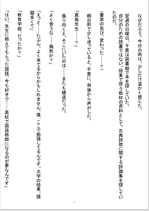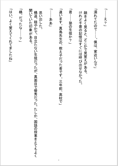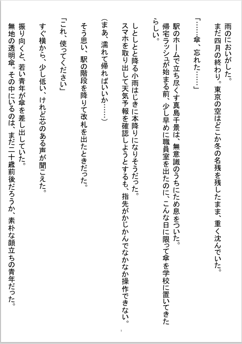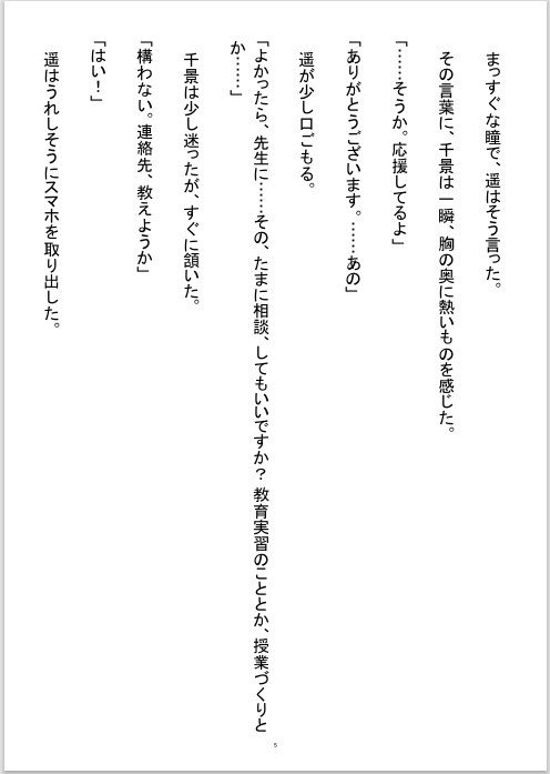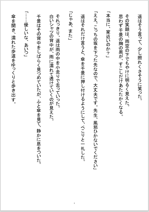 特徴:長身で素朴なイケメン。アルバイトで塾講師をしている。家庭環境に複雑な事情があるが前向きに努力している。 春の終わり、心に傷を抱えた高校教師・千景(ちかげ)は、ある雨の日に傘を差し出してくれた青年・遥(はるか)と出会う。無口で不器用ながらも、真っすぐに千景を見つめる遥の優しさに、閉ざしていた心が少しずつほどけていく。しかし、遥には“ある過去”と“ある願い”があって──。静かに紡がれる、言葉よりも深く伝わるふたりの心の交流。優しく、まっすぐで、どこか切ない、癒し系BLストーリー。