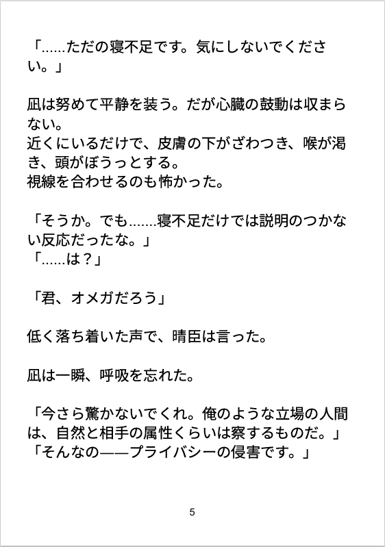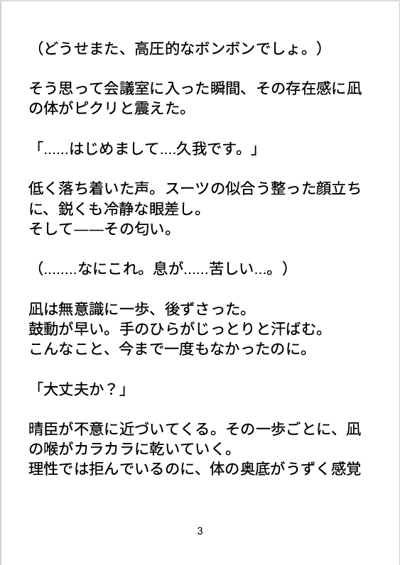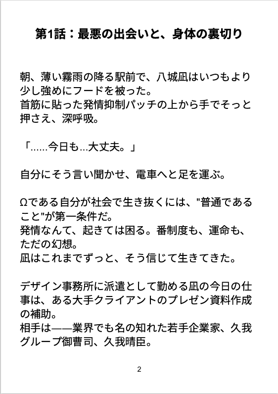 ◼️八城 凪(やしろ なぎ)・23歳/オメガ/デザイン専門学校卒/受け・貧しい家庭環境で育ち、番制度に懐疑的。・意地っ張りで強がり。発情期を薬で抑えて働いている。・「運命の番」なんて信じてなかったのに、晴臣に出会って体が裏切る。 ?あらすじ(販売ページ掲載用)発情を抑え、番制度を拒絶しながら生きていたΩ・凪は、ある日、アルファの御曹司・久我晴臣と出会う。理性的で無関心そうな晴臣なのに、なぜか凪の体は強く反応してしまい――それは、運命の番の証。