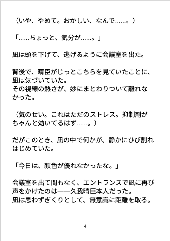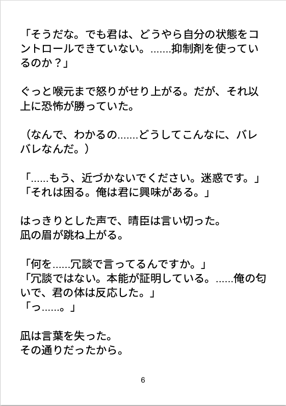 凪は必死に拒もうとするが、晴臣は決して引かない。理性を奪われるような発情、甘く激しい交わり。そして彼の執着に、凪の心も揺らいでいく。