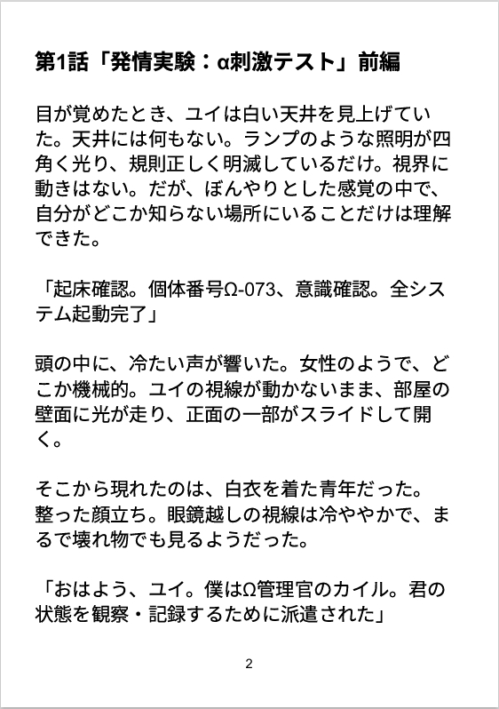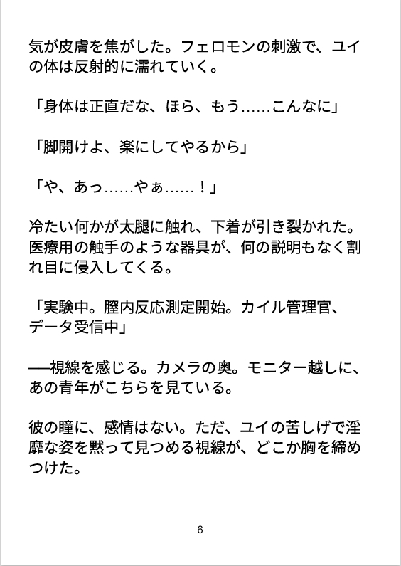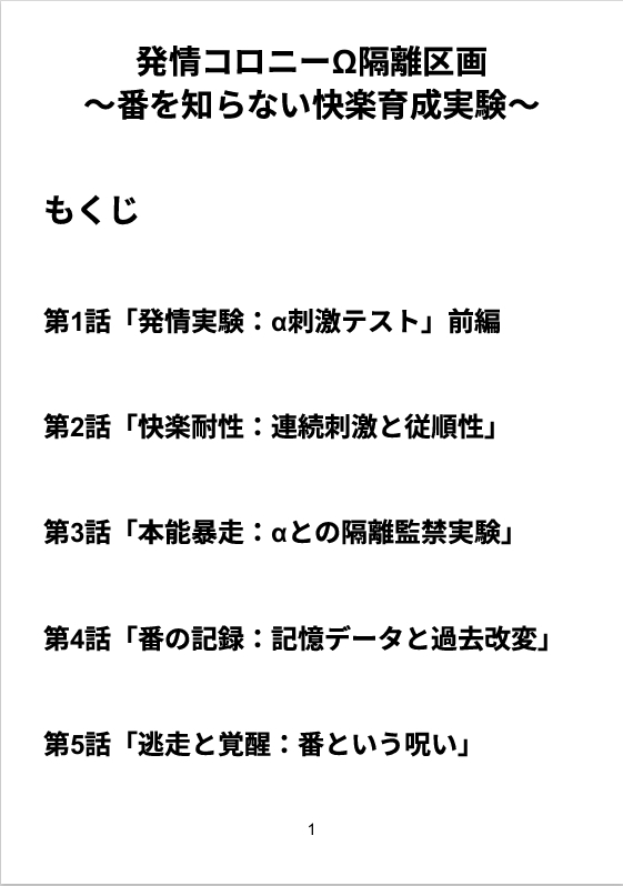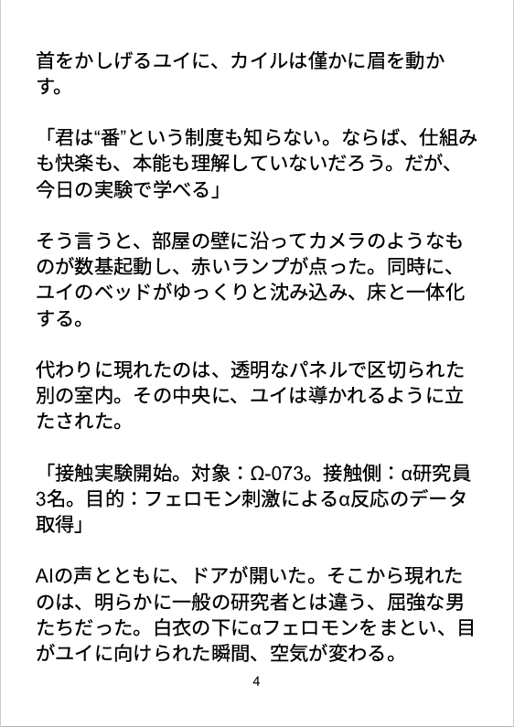 ●ナレーション的存在:人工知能(通称:リュクス)施設を管理するAI。ユイの記録を逐一記録・分析する役割。時に無機質に、時に嗜虐的に「調教プログラム」を導入する。 ■あらすじ(全体)人間の“番(つがい)”制度を再構築するための政府機関「Ω育成コロニー」では、アルファに選ばれるΩを作るための調教・発情・交配管理が行われていた。