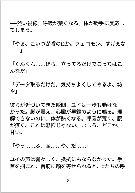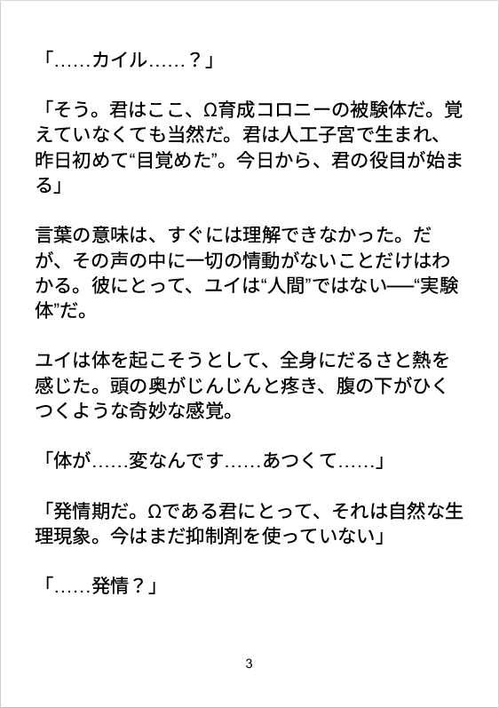 施設内で目覚めたユイは、自分が“実験Ω”であることも、番という存在が何なのかも知らない。ただ、自分の中から湧き上がる熱と疼きに、無垢な興味を持つだけ。そんなユイに対し、管理官カイルは非情に接するはずだったが、次第にその体と心の変化に引き込まれていく。