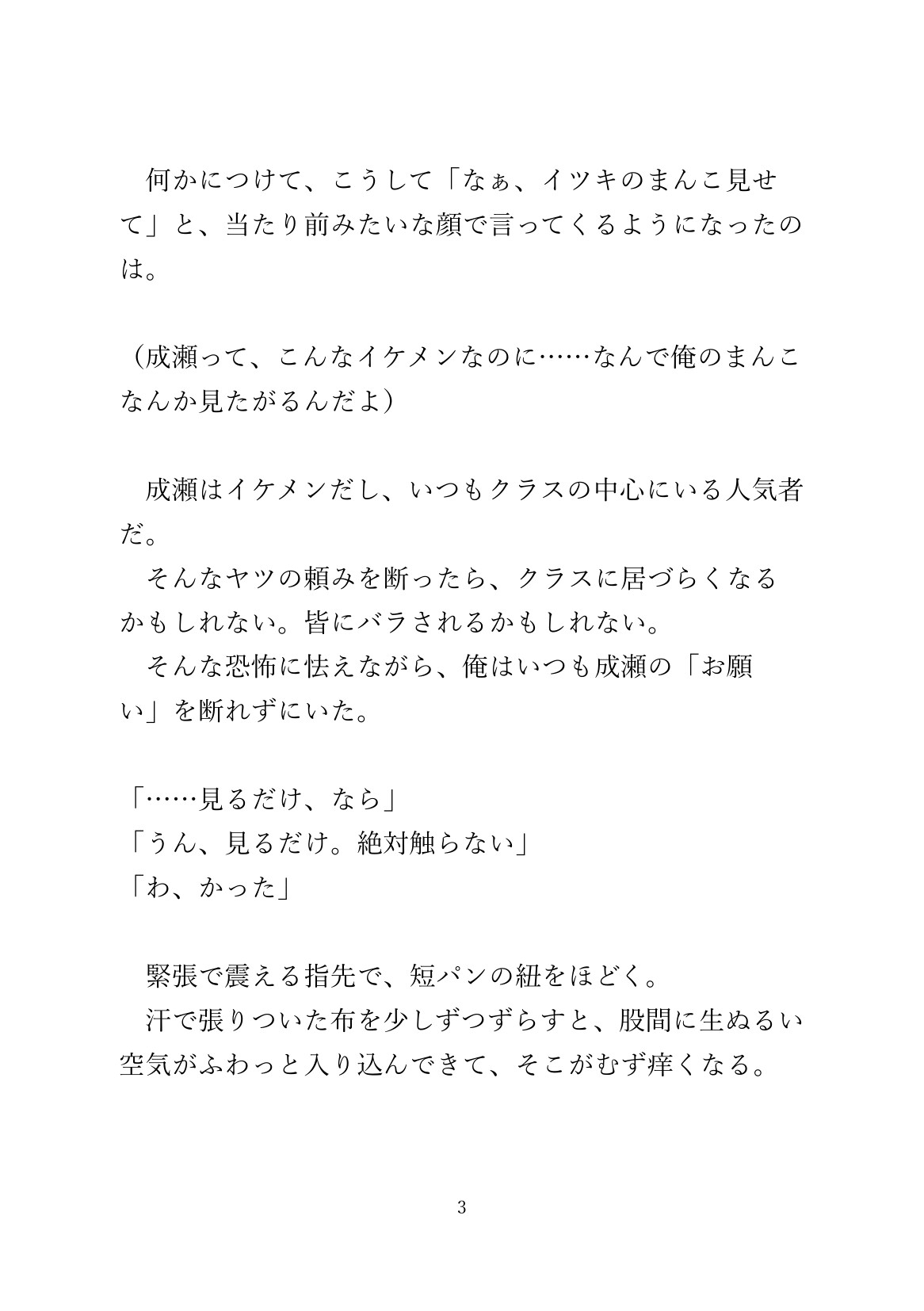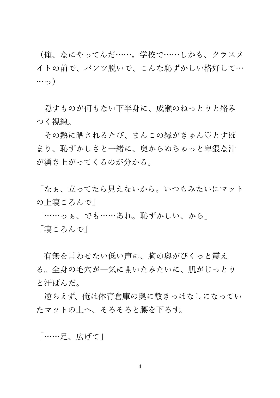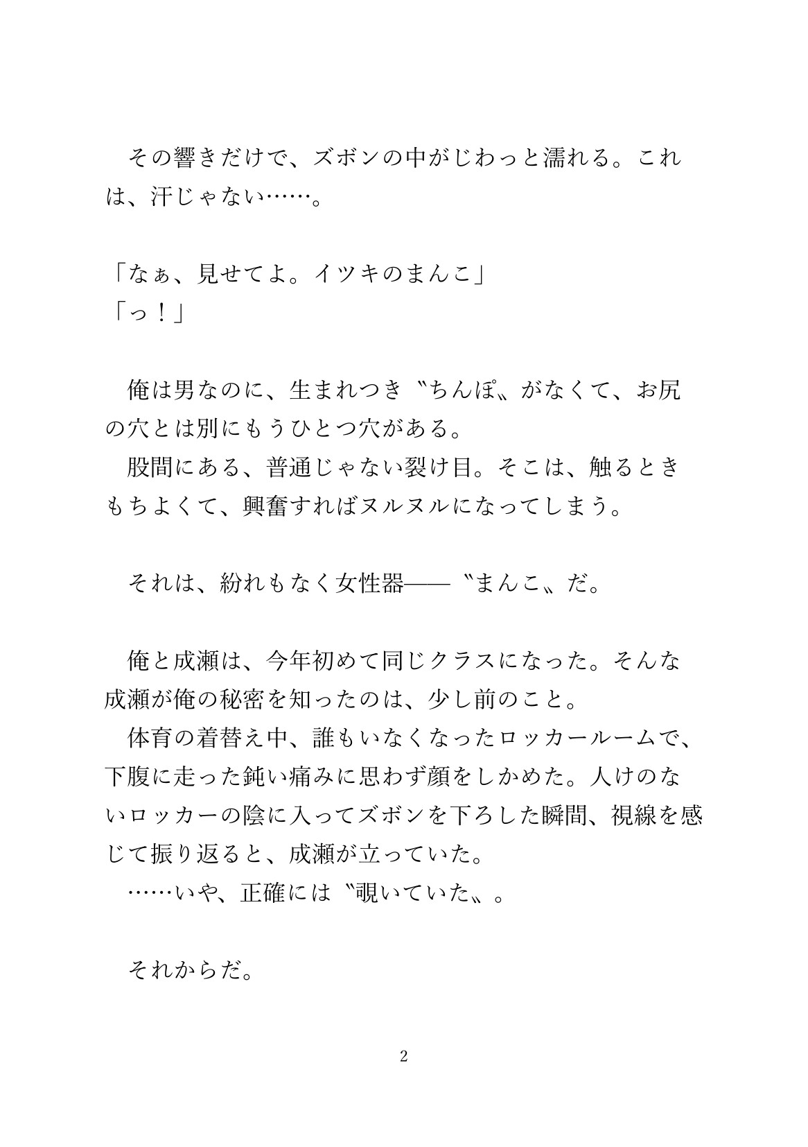 クラスメイトのイケメンに、ま〇こがあることがバレてしまった大人しいカントボーイが、何かにつけて「ま〇こ見せて」と頼まれる話。体育館倉庫でま〇こを観察され、クリ舐められ潮吹きしつつ、最後は「二人で赤ちゃん作ろ」と、ち〇ぽを挿れられたのち子宮に中出しされまくってます。