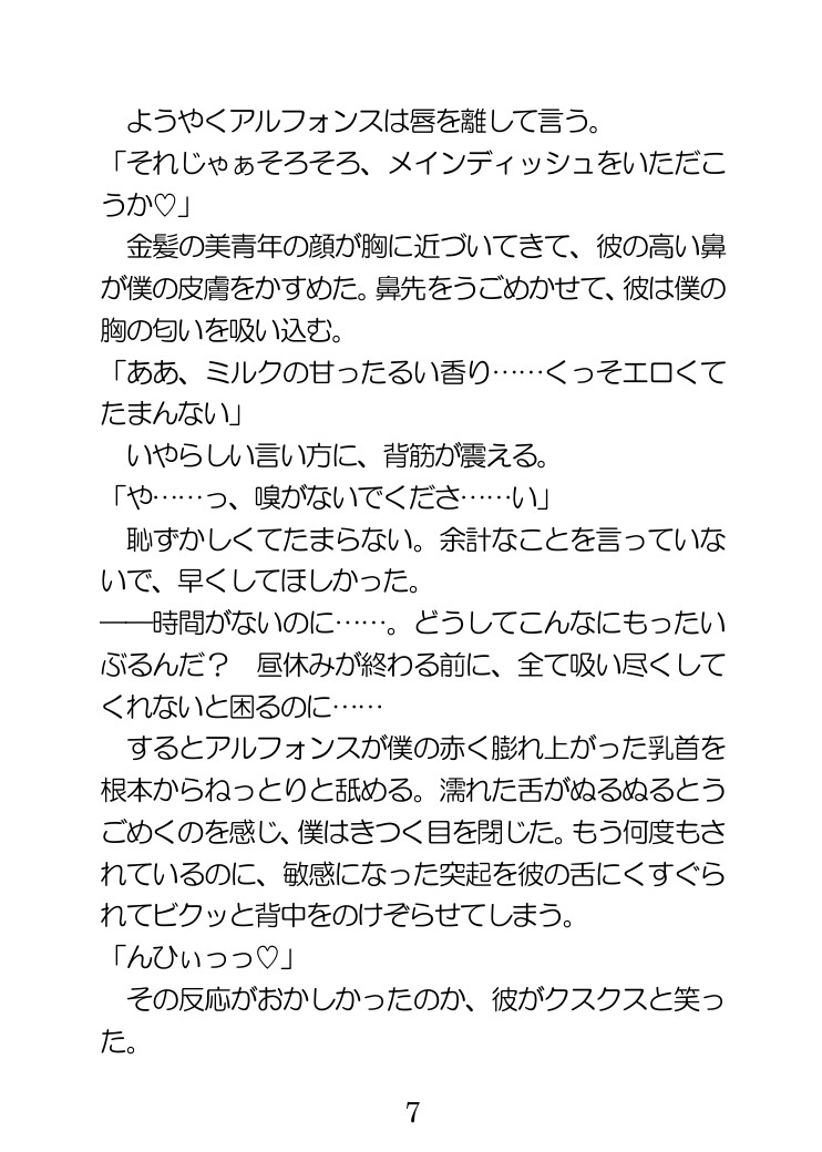 ――何が王子だ……ド変態の悪魔じゃないか!胸が張って仕方ないハルマはアルフォンス王子に母乳を吸い出してもらうことに。するとアルフォンスはハルマに執着し、恋人なろうと迫ってくる。ノンケだが、強引な王子におっぱいを吸われ、身も心もとろけさせられていくハルマ。しかしそんなとき、王子が女性と密会しているのを見てしまい――?