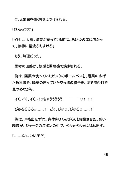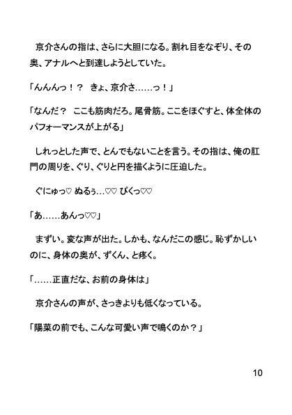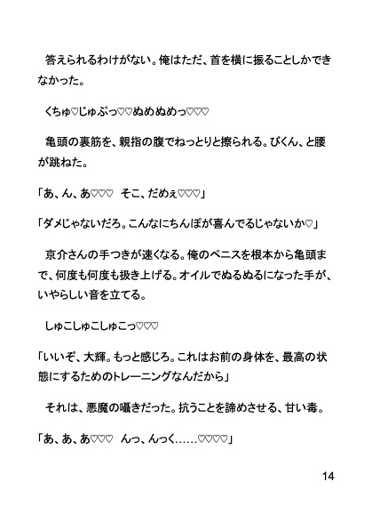 その言葉をきっかけに、二人きりの秘密の「トレーニング」が始まる。ロッカールームでの執拗な愛撫、シャワールームでの屈辱的な奉仕、そしてトレーニングルームでの「体幹強化」という名の、初めてのアナル開発。京介は「すべては陽菜のためだ」と囁きながら、大輝のプライドを打ち砕き、その身体を背徳的な快感で満たしていく。