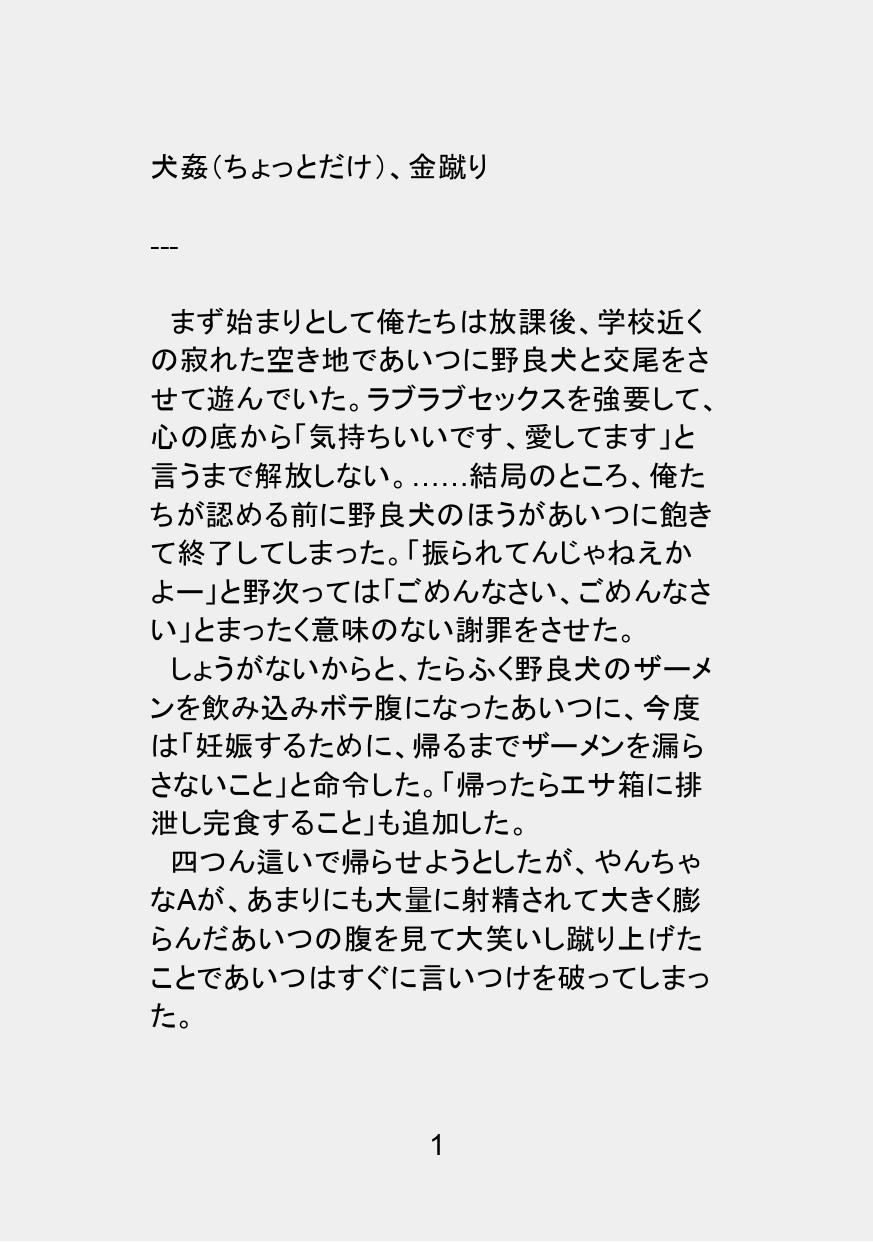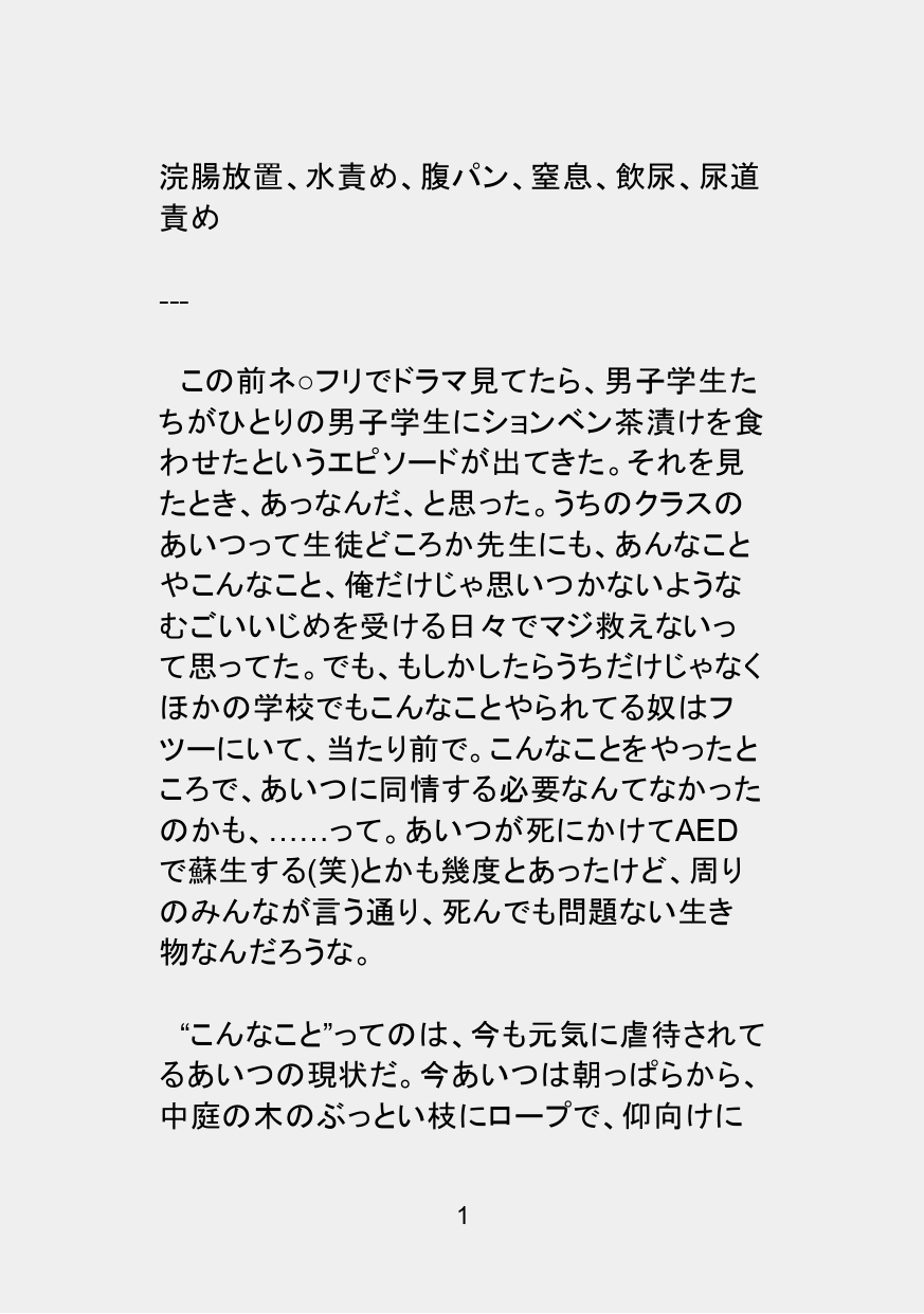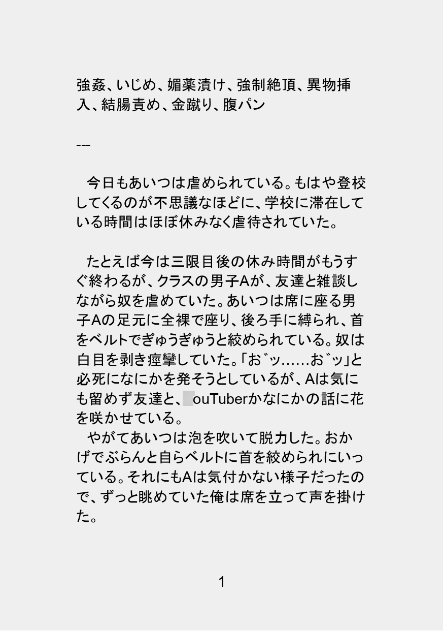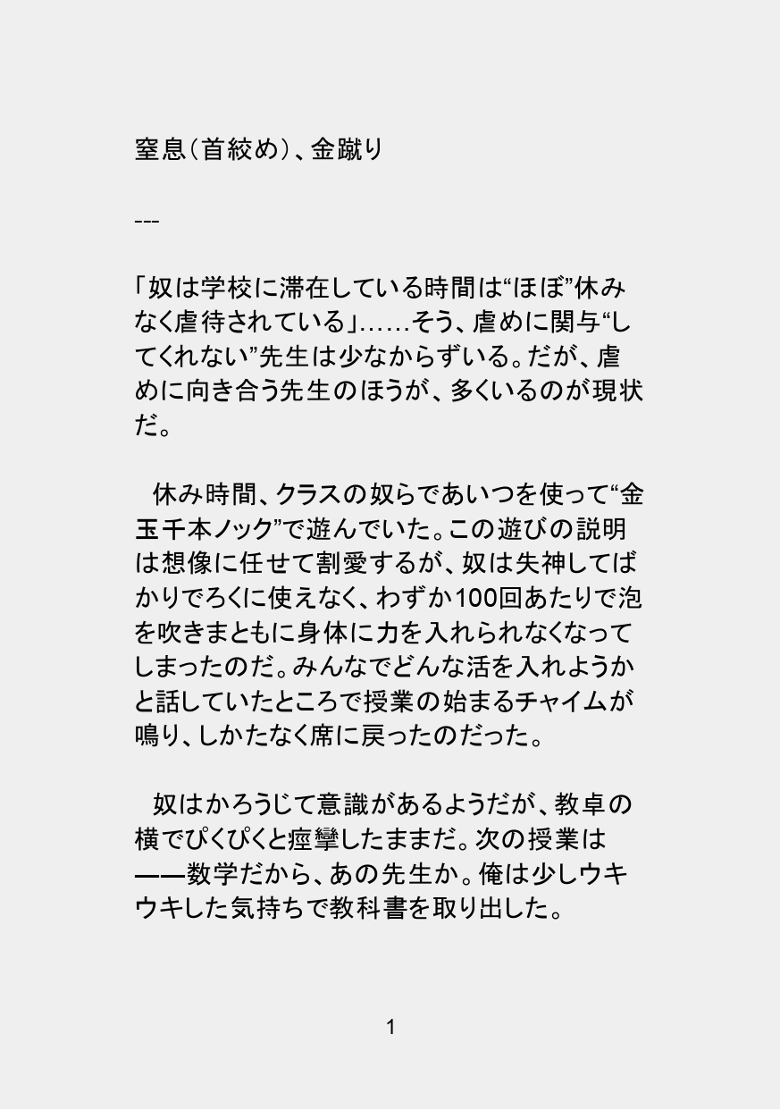 01クラスのいじめられっ子(3606字/11p)02いじめに向き合う先生(2603字/8p)03ある昼休みの出来事(4951字/14p)04ロッカー閉じ込めたり金玉虐めたり(4824字/14p)05中庭で小便タンクにしたりサンドバッグにしたり(11499字/33p)06学校外の空き地でサッカー(2573字/8p)