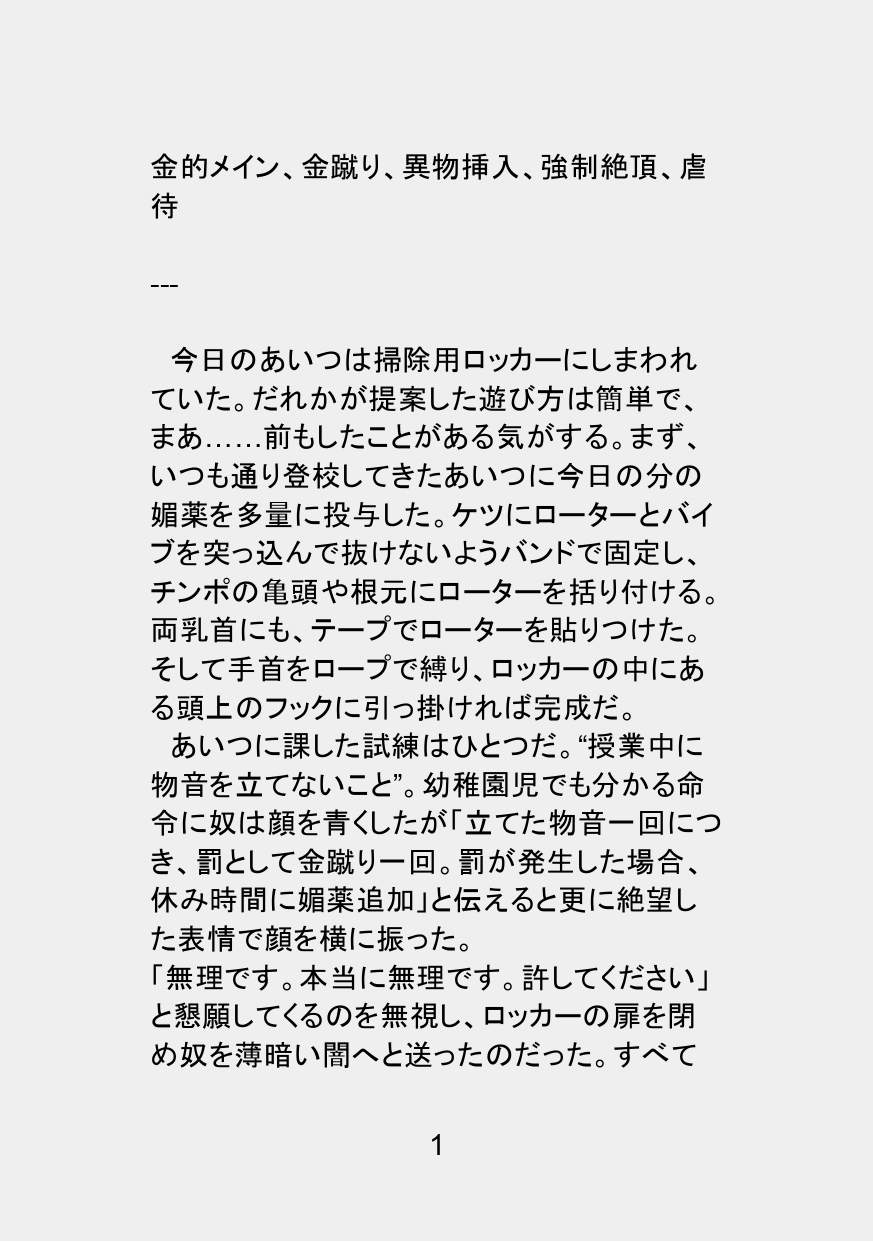 強○、いじめ、媚薬漬け、強○絶頂、異物挿入、結腸責め、金蹴りなど、容赦なくいじめます。