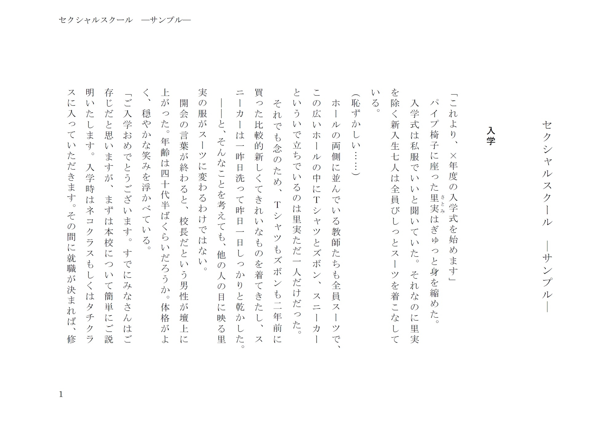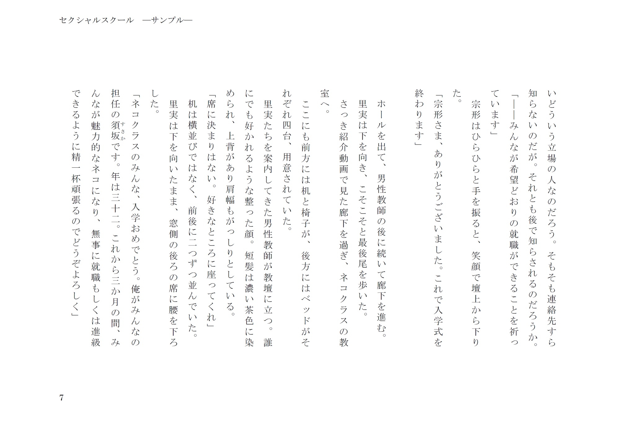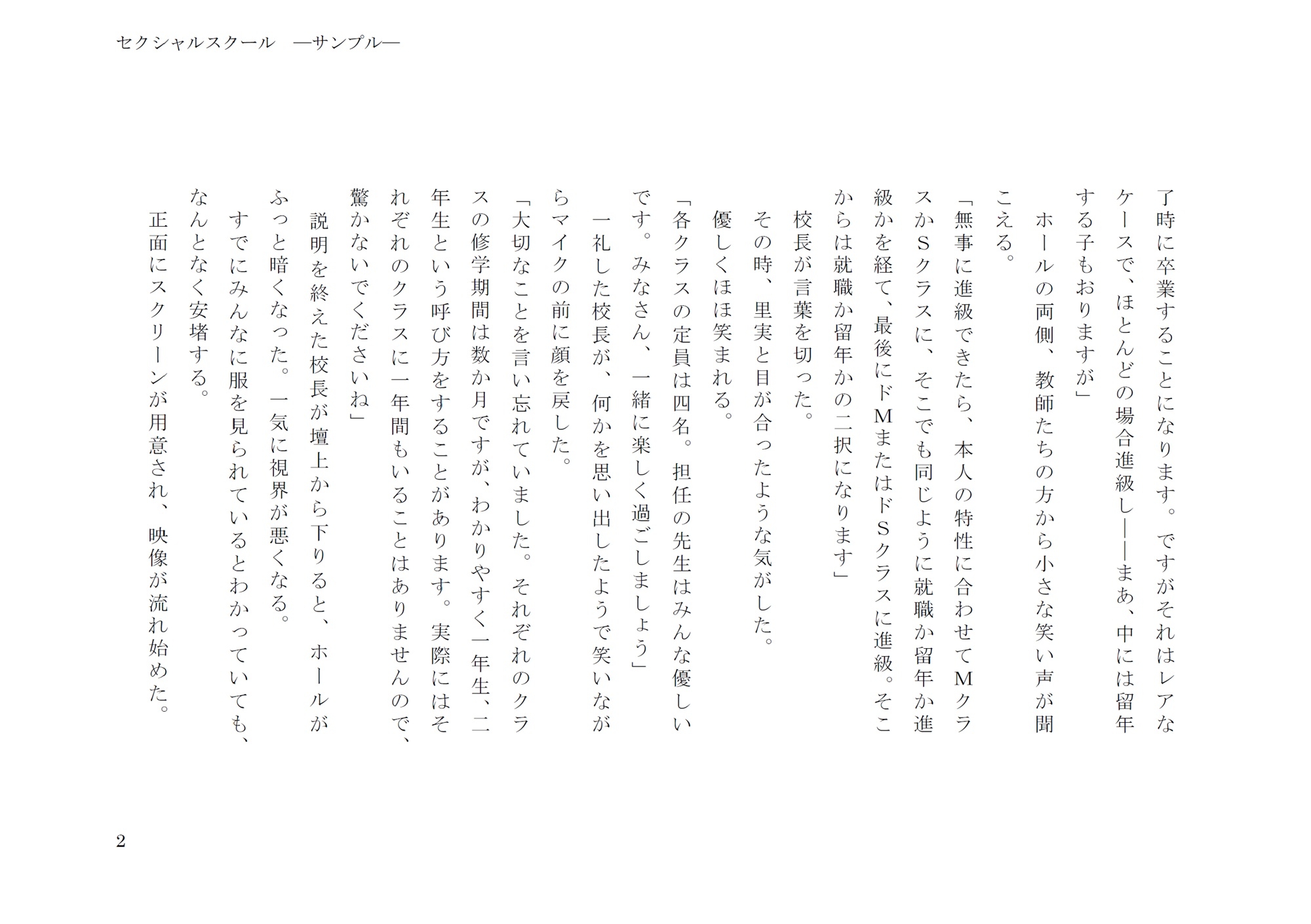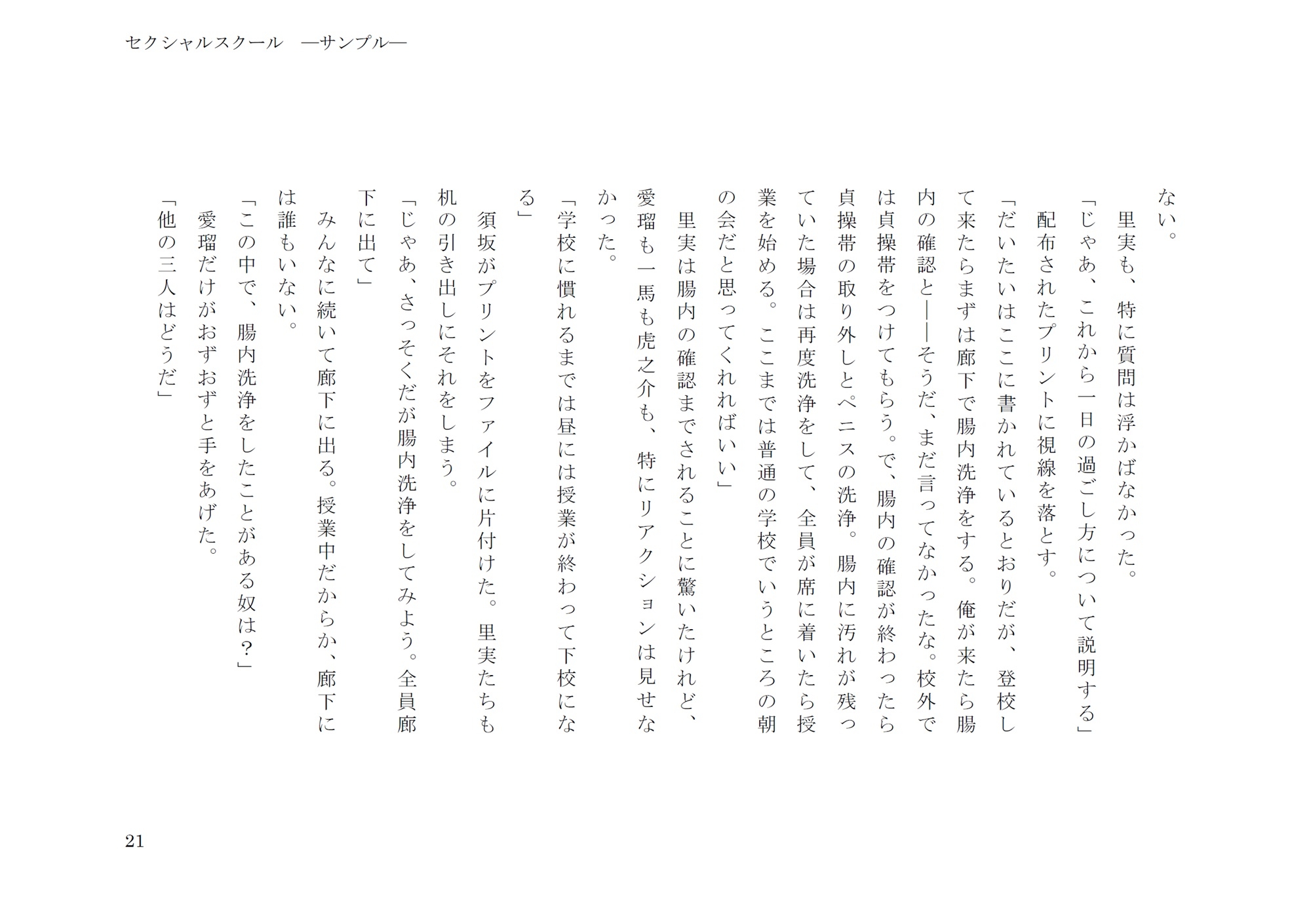 ゲイのセックスやSMについて学ぶ「セクシャルスクール」に入学した里実。爽やかイケメンな担任、須坂。クラスメイトの愛瑠、一馬、虎之介。勉強も運動もろくにできない。けれど、セックス関係なら上手にできるかもしれないと胸に期待を抱いて入学した里実だったが、セックス関連もぽんこつで――。