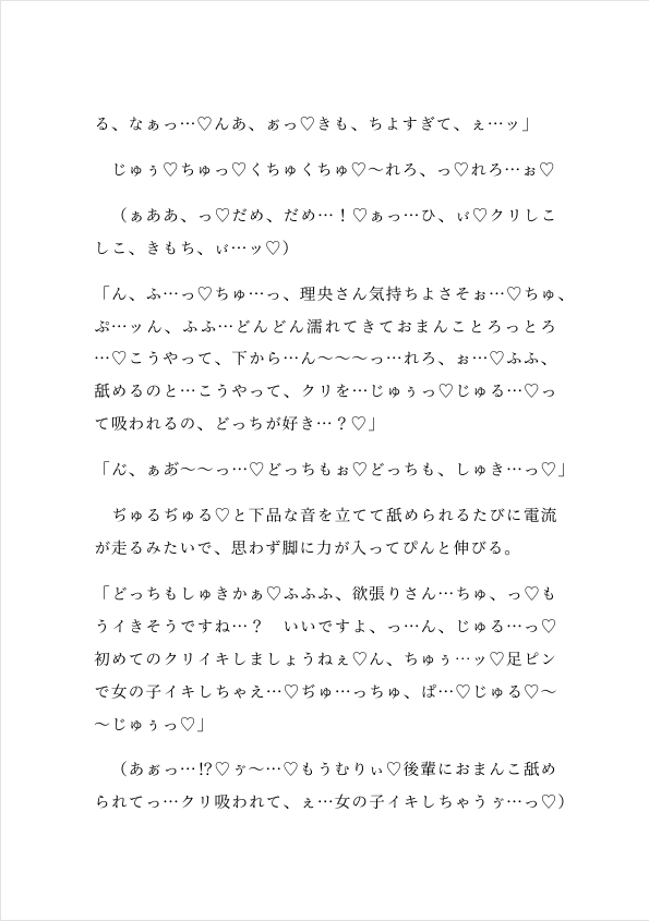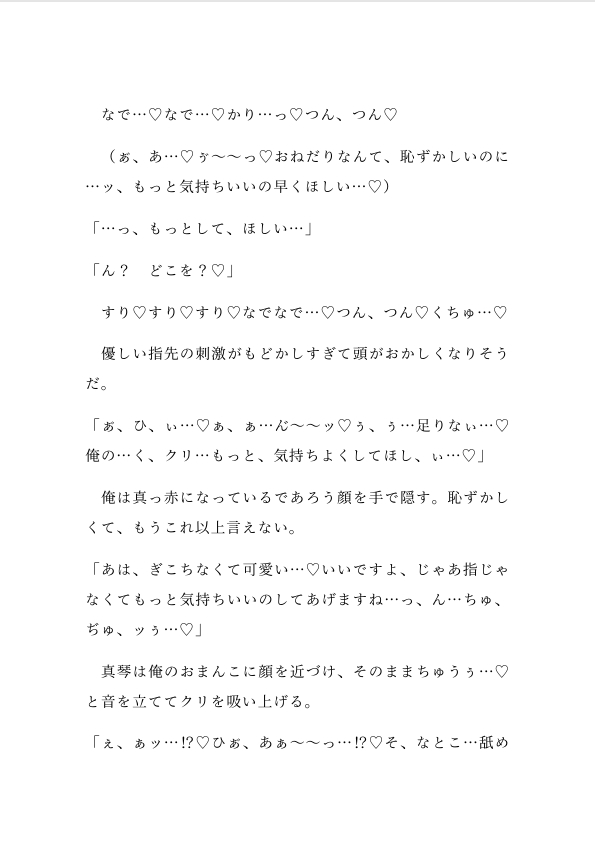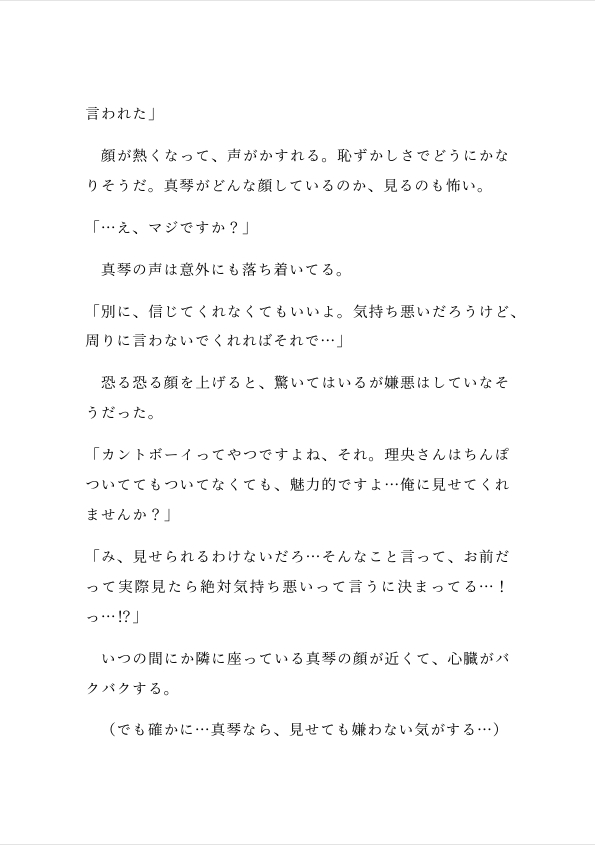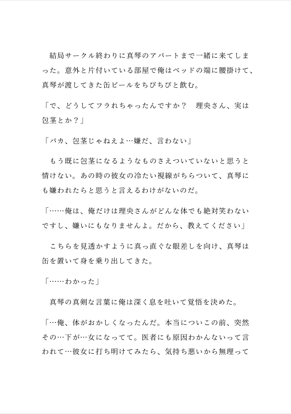 【登場人物】■攻め…真琴(まこと) 20歳 理央の大学の後輩 密かに理央に好意を寄せていたため、傷心中の彼をなぐさめようとする。■受け…理央(りお) 21歳 真琴の大学の先輩 ある日突然カントボーイになり彼女にフラれる。真琴に流されるまま抱かれてしまう。