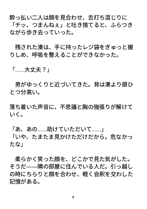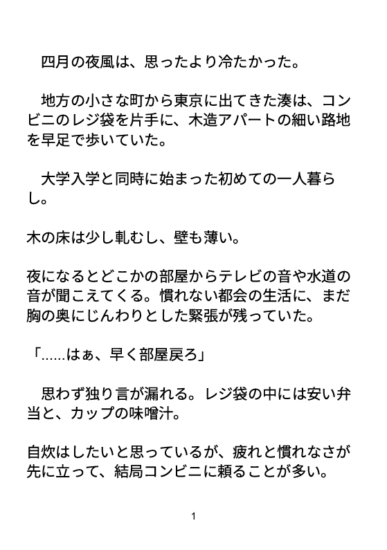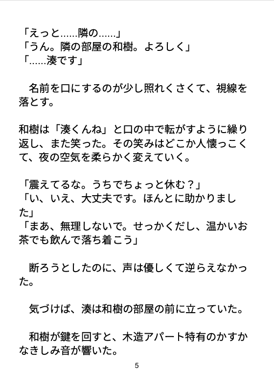大学進学を機に上京した湊は、初めての一人暮らしに不安を抱えていた。ある夜、隣の部屋の先輩・和樹に酔っ払いから助けられ、部屋に招かれる。