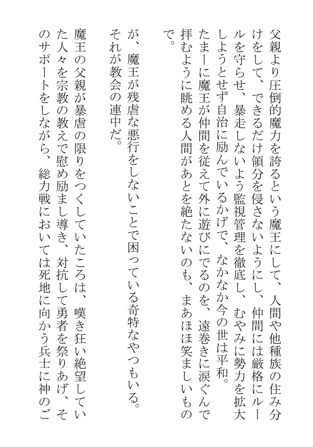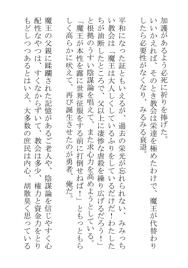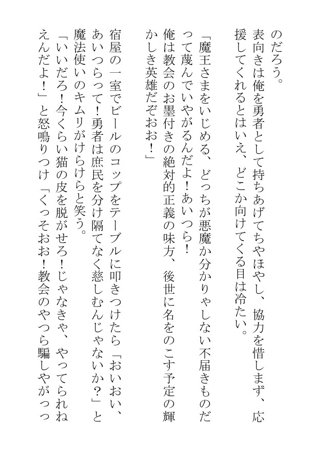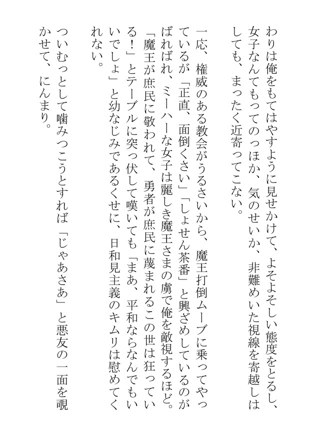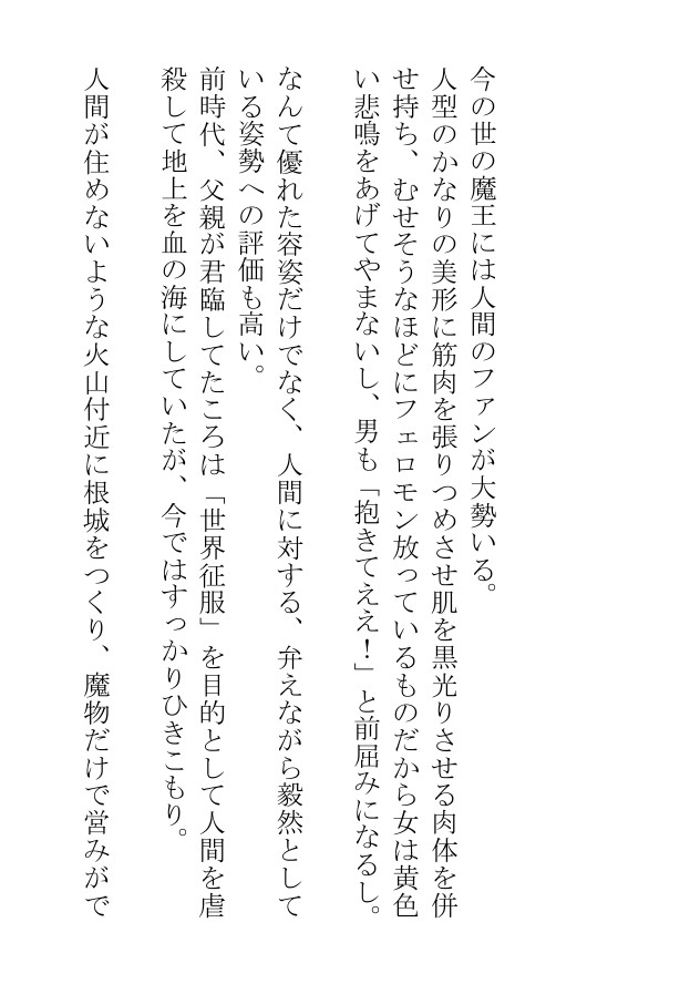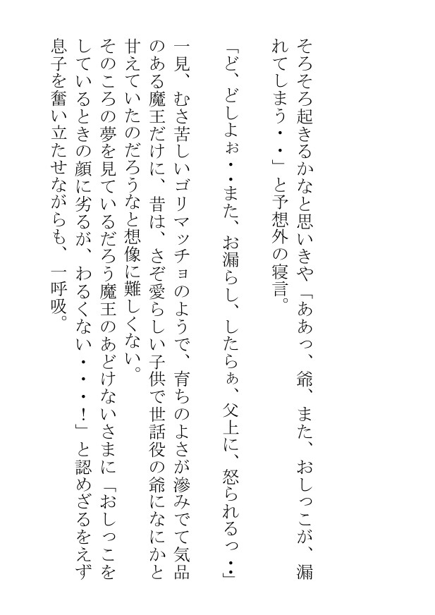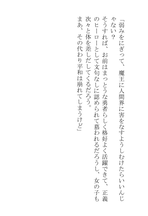 なにかと事情があって、裏でやさぐれている勇者は、悪友にそそのかされて魔王の弱味をにぎろうと。それが、なぜか魔王が放尿するところを目撃し、どこかエッチな雰囲気を醸すのに心を奪われてしまい、とうとう耐えられず、寝室に乗りことに・・・。